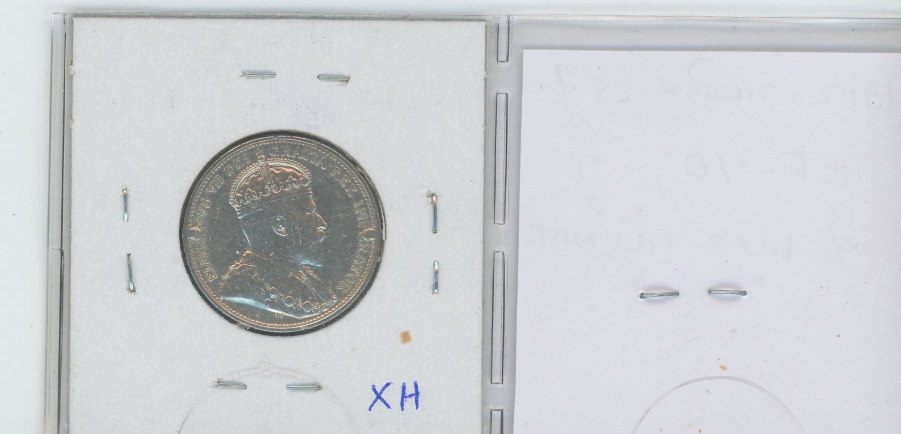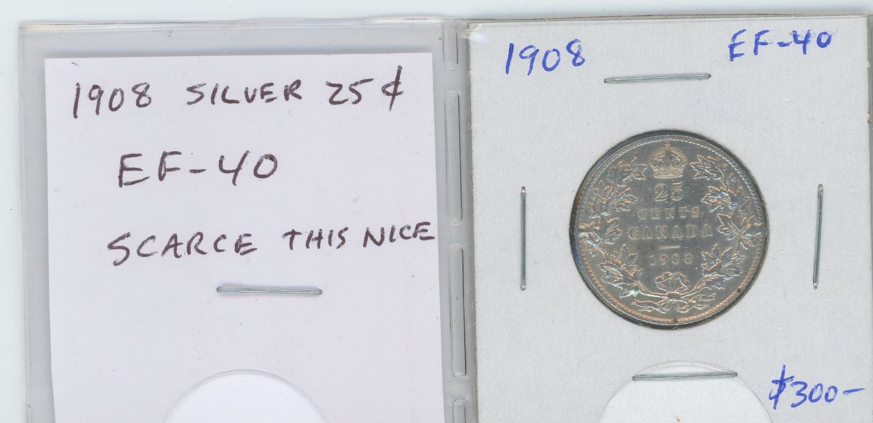 1908 EDWARDIAN SILVER 25 CENTS. EF-40. SCARCE. THE FIRST YEAR 25 CENTS WERE MINTED IN CANADA.