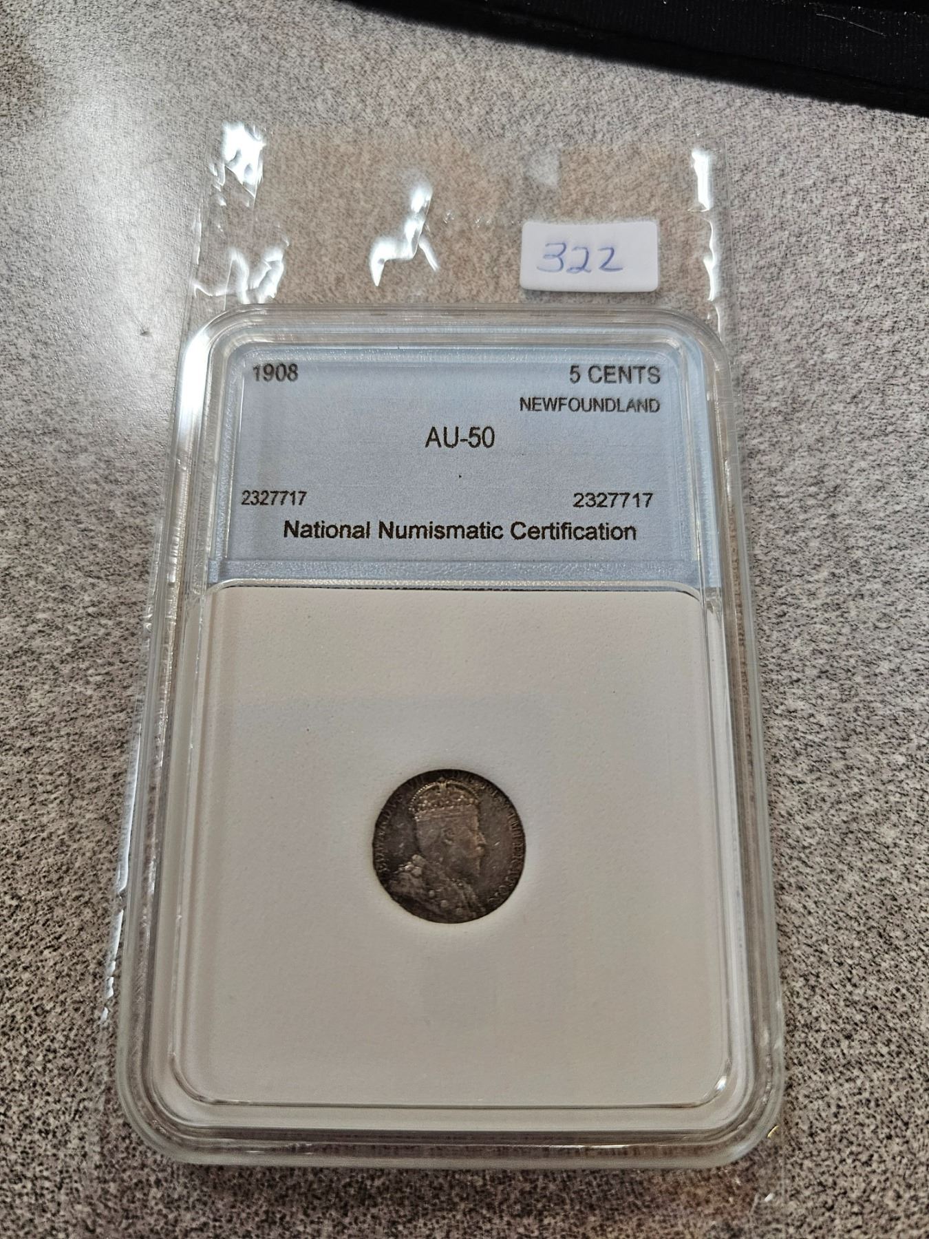 1908 Graded AU-50 Newfoundland five cents 5¢