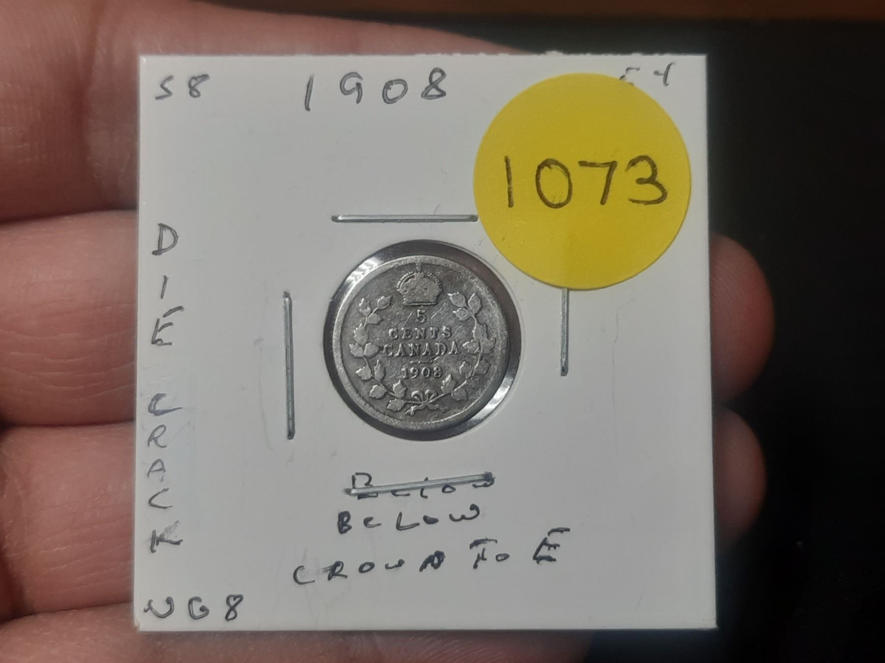 1908 NICKLE VG8 Canadian Nickle, DIE CRACK BELOW CROWN TO E