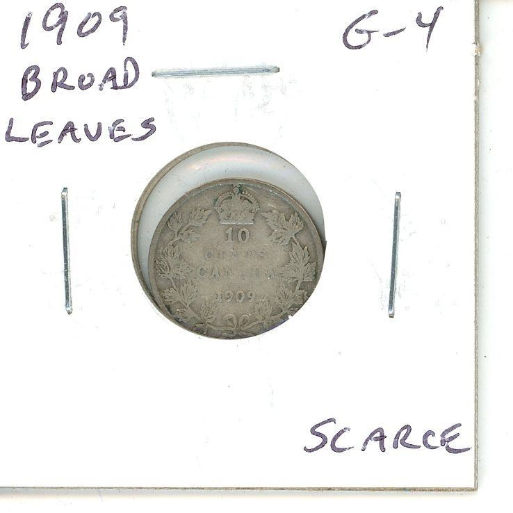 1909 Broad Leaves Canadian Silver 10 Cents. G-4. Scarce.