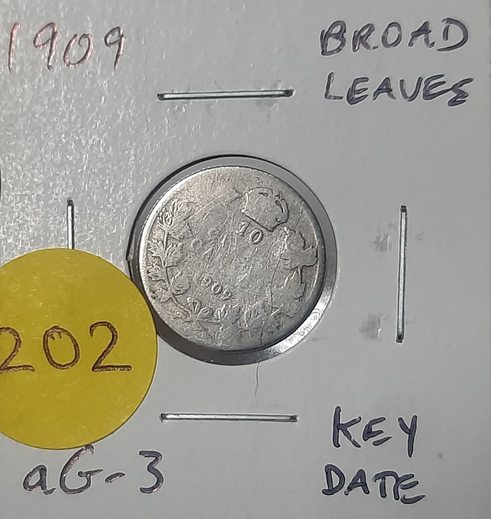 1909 Broad Leaves Silver 10 Cents. Key Date. aG-3 with readable date.