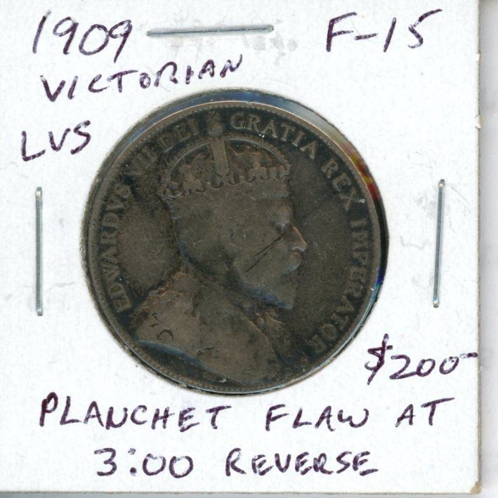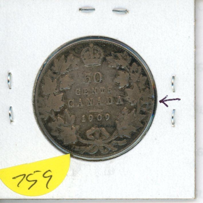 1909 Victorian Leaves Canadian Silver 50 Cents. The coin displays a Planchet Flaw on the reverse, the result of a Delamination. F-15. Hard to find.