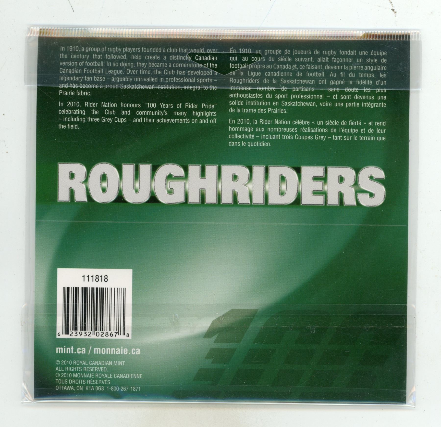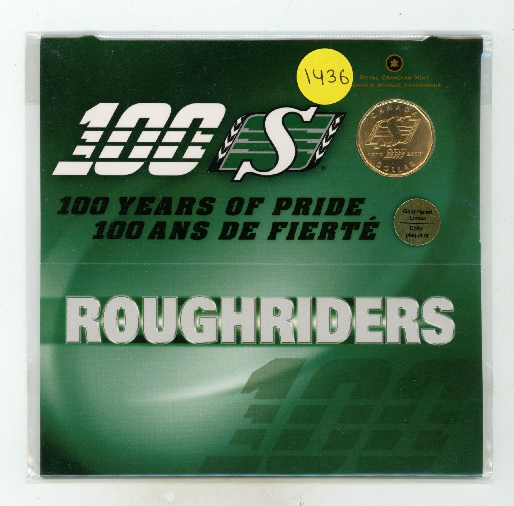 1910 – 2010 Saskatchewan Roughriders Gold Plated Loonie. Housed in its original unopened Royal Canadian Mint folder.