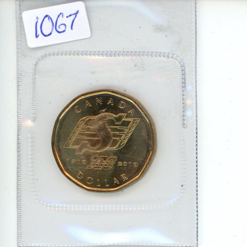 1910 – 2010 Saskatchewan Roughriders Loonie Dollar. Housed in its original Royal Canadian Mint packaging.