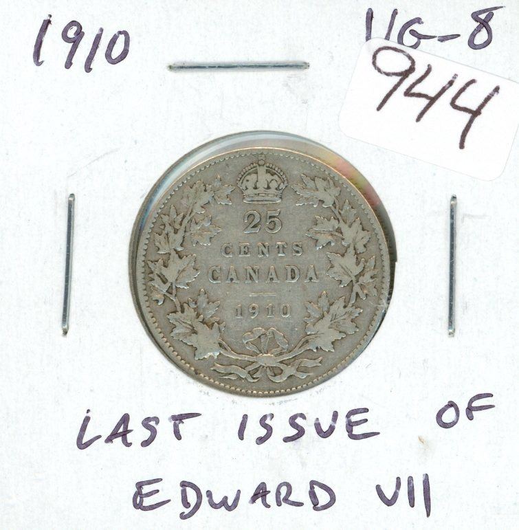 1910 Canadian Edward VII Silver 25 Cents. Last silver 25 cents minted for King Edward VII. VG-8.