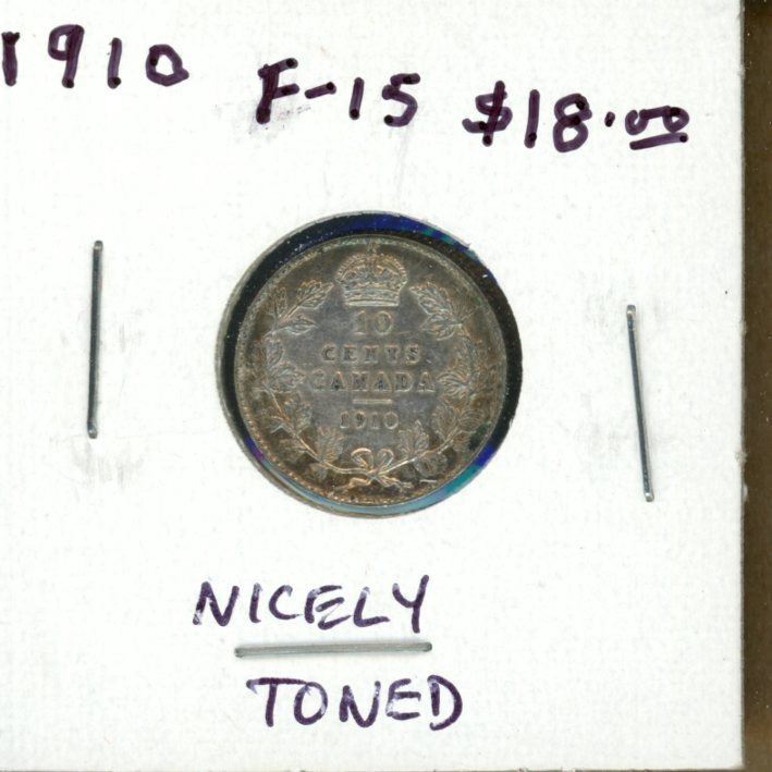 1910 Canadian Silver 10 Cents. The last 10 cents issued for King Edward VII. F-15. Nicely Toned.