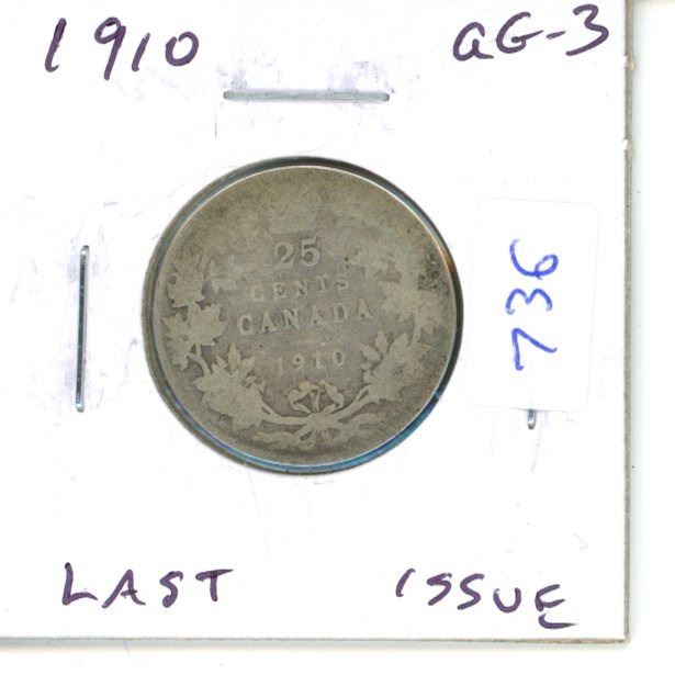 1910 Canadian Silver 25 Cents. Last coinage of King Edward VII. aG-3. Readable Date.