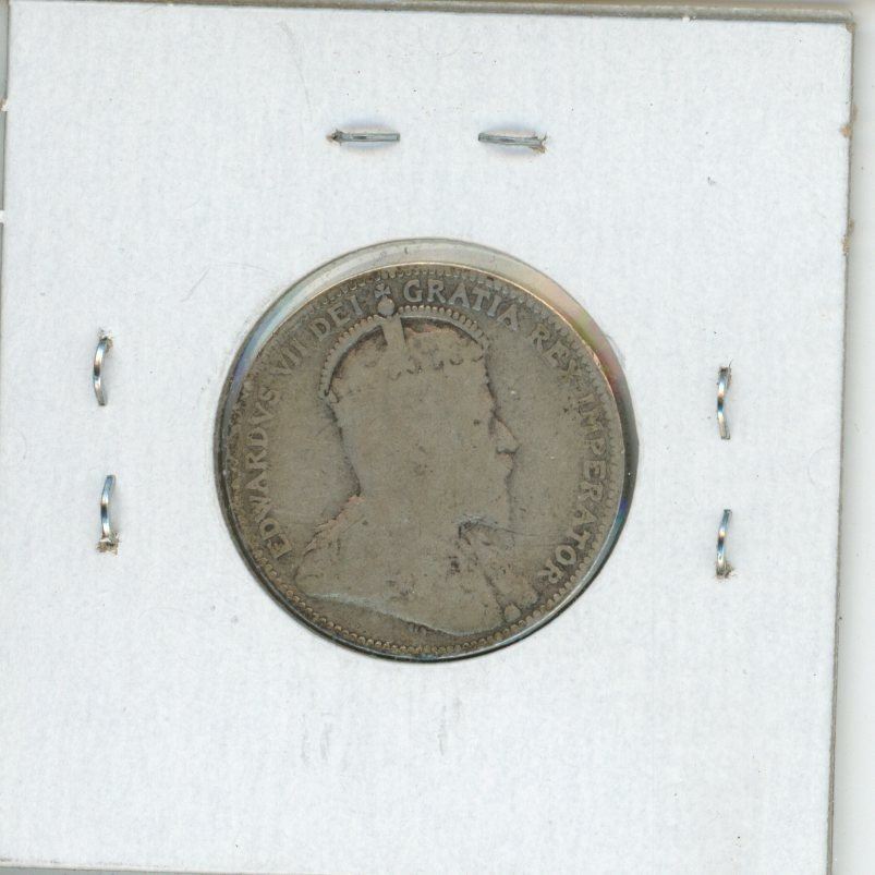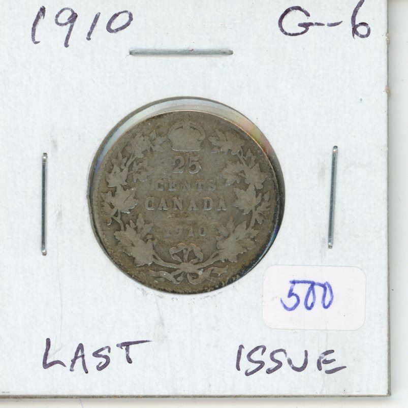 1910 Canadian Silver 25 Cents. Last issue of King Edward VII. G-6.