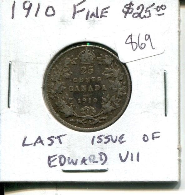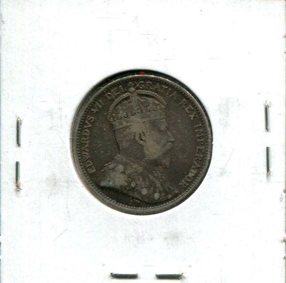1910 Canadian Silver 25 Cents. The last 25 Cents issued for Edward VII. F-12.