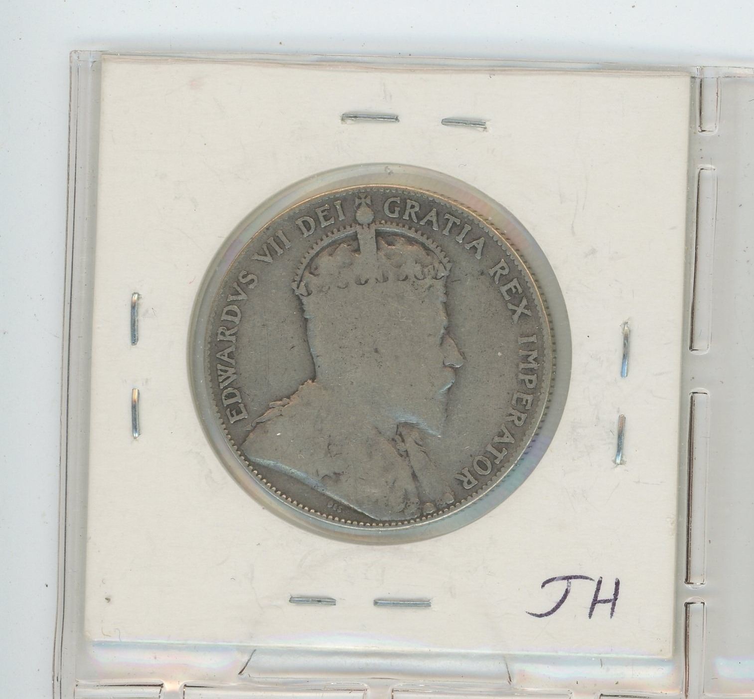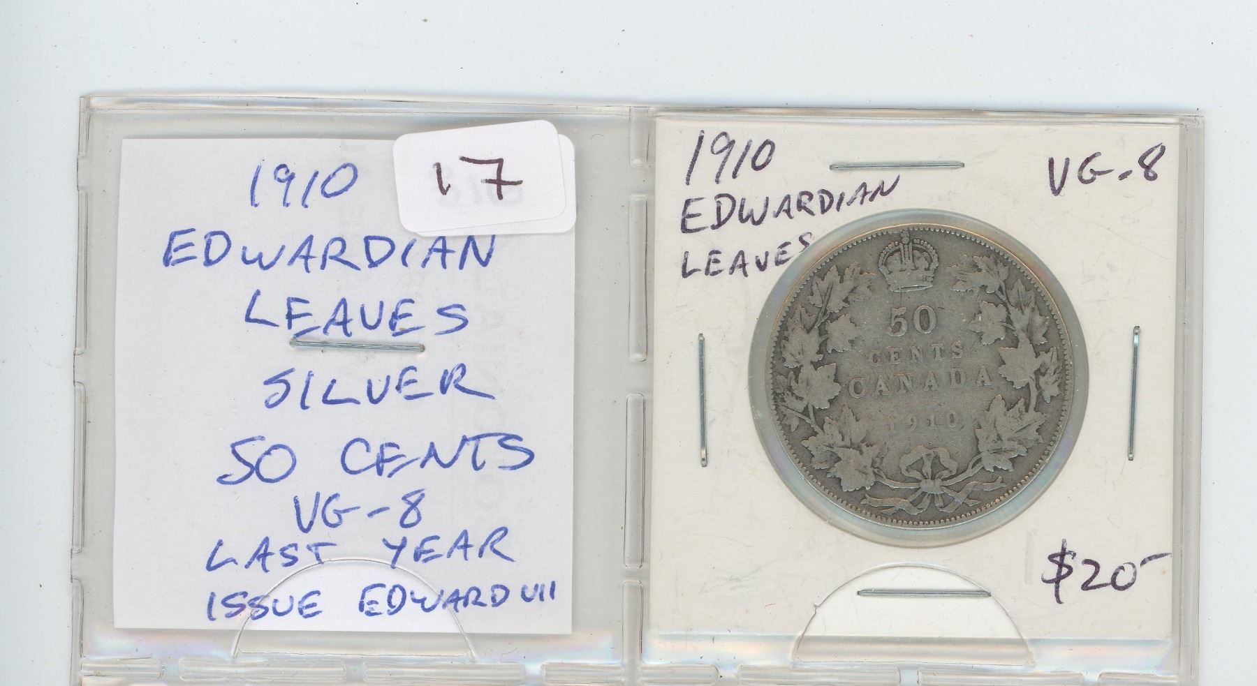 1910 EDWARDIAN LEAVES SILVER 50 CENTS. THE LAST YEAR OF ISSUE OF EDWARD VII. VG-8.