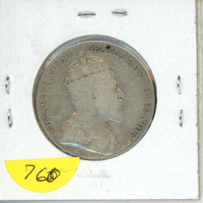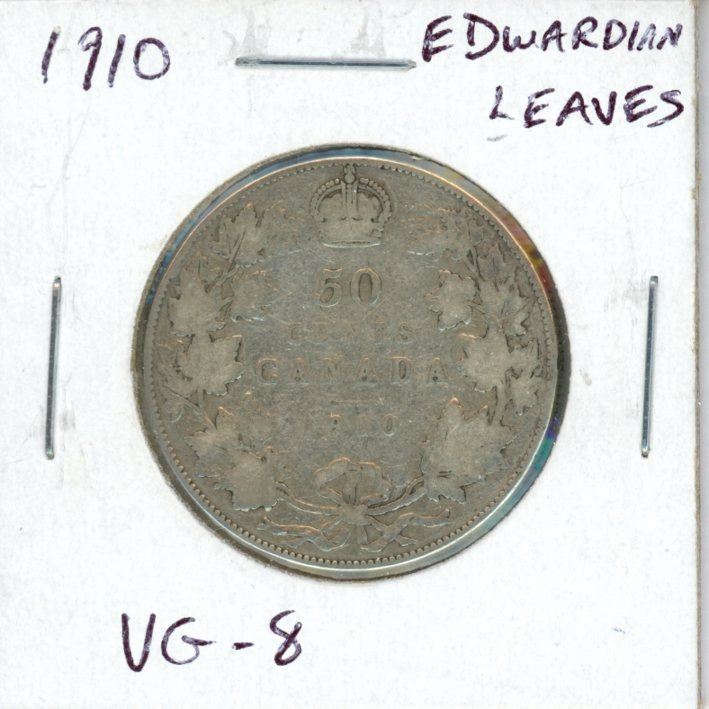 1910 Edwardian Leaves Canadian Silver 50 Cents. The last silver 50 Cents issued for King Edward VII. VG-8.
