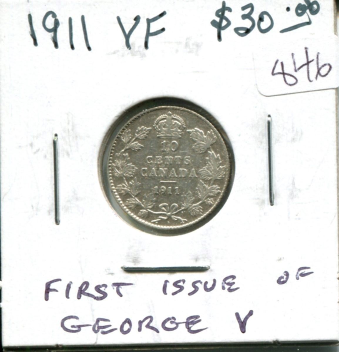 1911 Canadian Silver 10 Cents. The first 10 Cents issued for George V. VF-20. Nice.