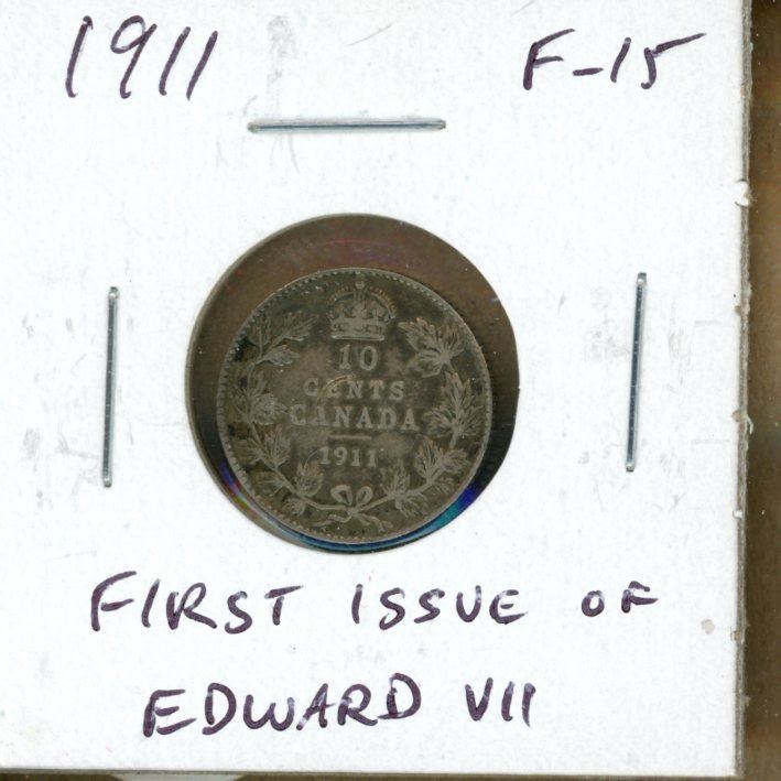 1911 Canadian Silver 10 Cents. The first 10 cents issued for King George V. F-15.