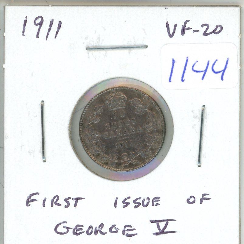 1911 Canadian Silver 10 Cents. The first Silver 10 Cents issued for King George V. VF-20. Nice.
