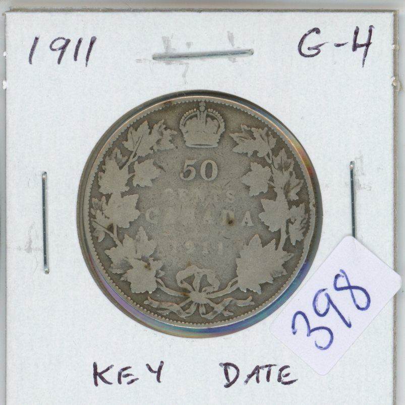 1911 Canadian Silver 50 Cents. The first Silver 50 Cents minted for King George V. Mintage of 209,972. G-4.