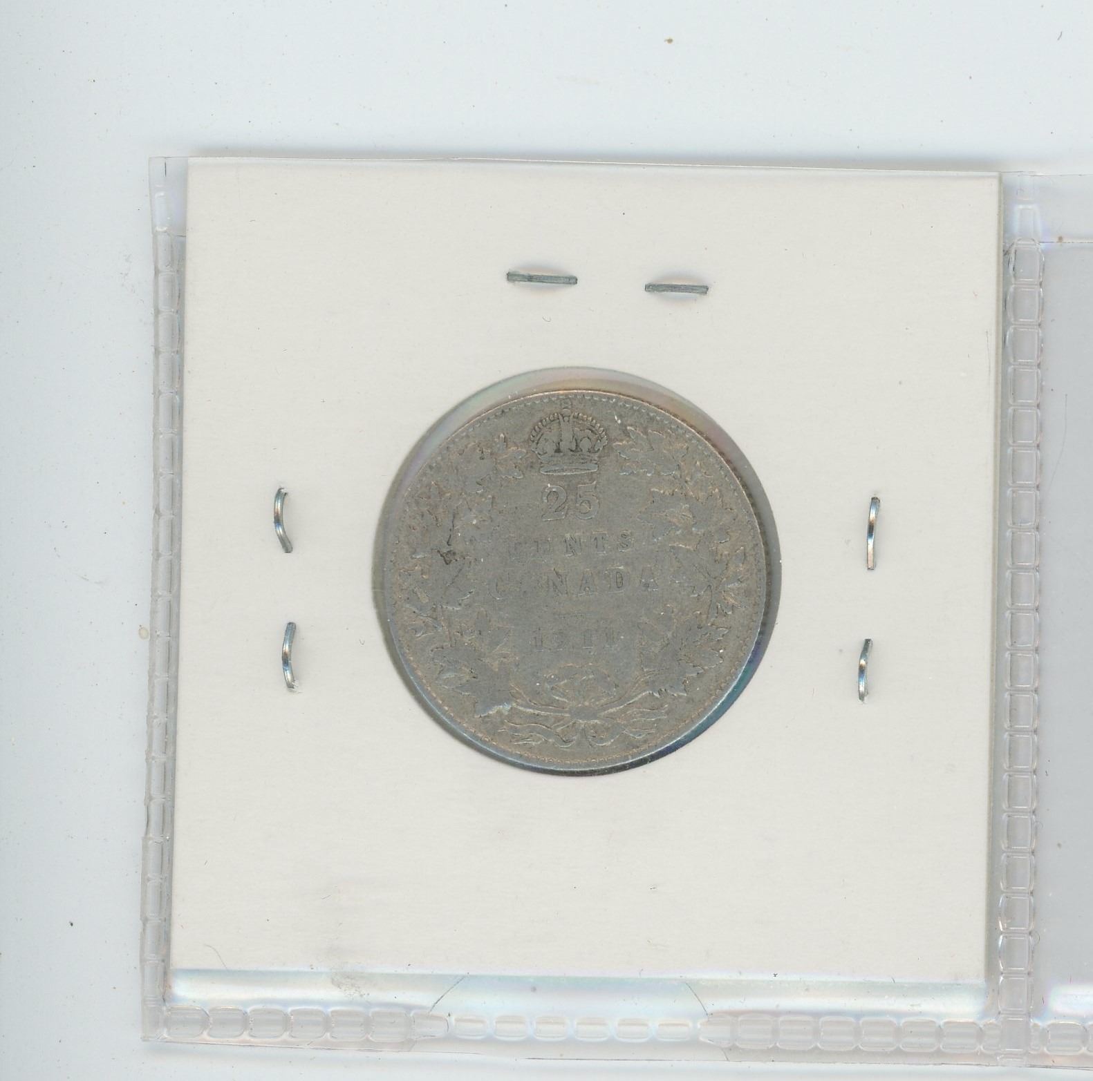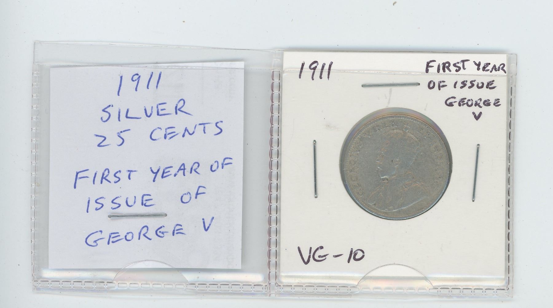 1911 George V silver 25 cents. VG-10. First year of issue for the new king.