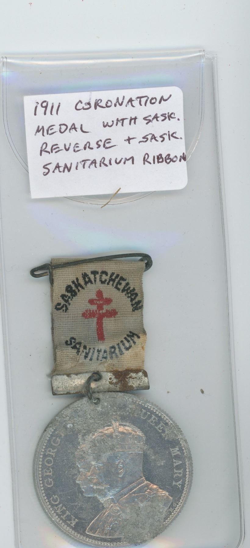 1911 KING GEORGE V CORONATION MEDAL WITH SASKATCHEWAN COAT OF ARMS REVERSE AND SASKATCHEWAN SANITARIUM RIBBON. ISSUED BY THE SASKATCHEWAN ANTI-TUBERCULOSIS LEAGUE.