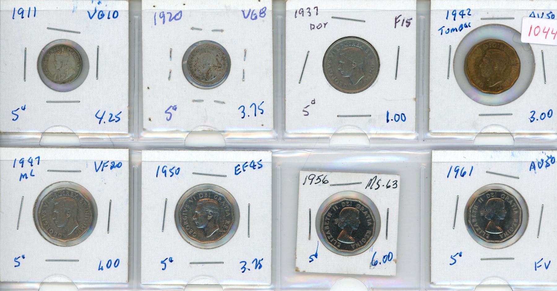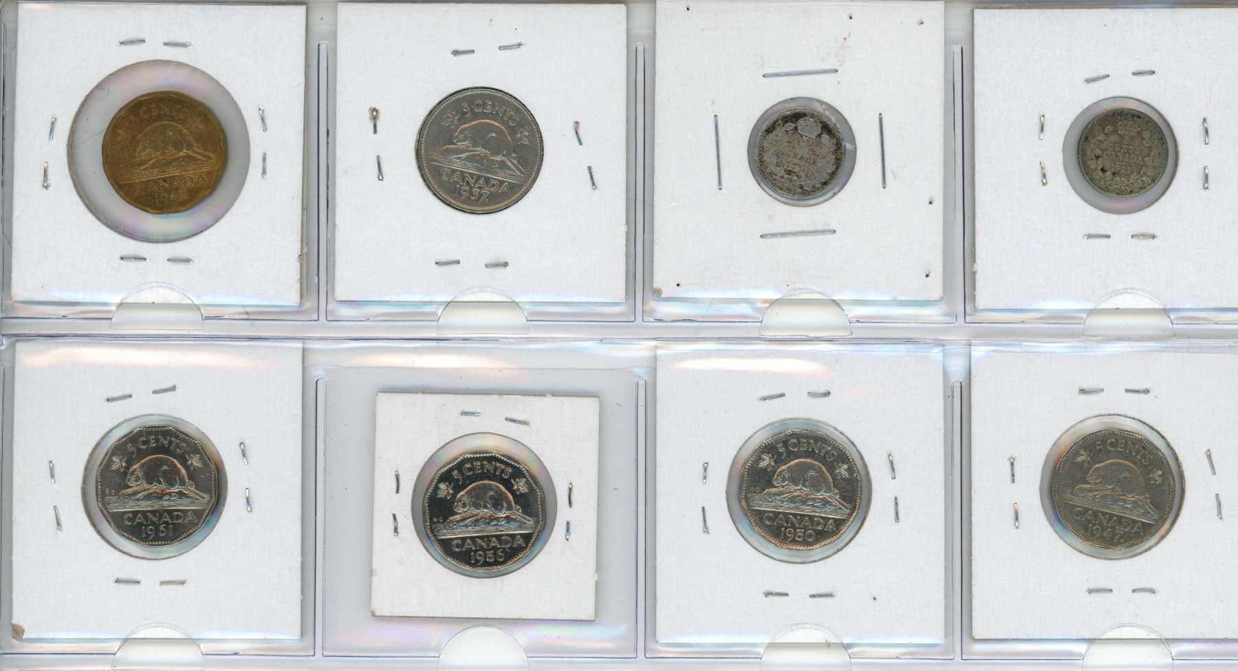 1911-VG10,1920-VG8,1937-F15,1942-AU50,1947-VF20,1950-EF45,1956-MS-63,1961-AU50 Canada nickels