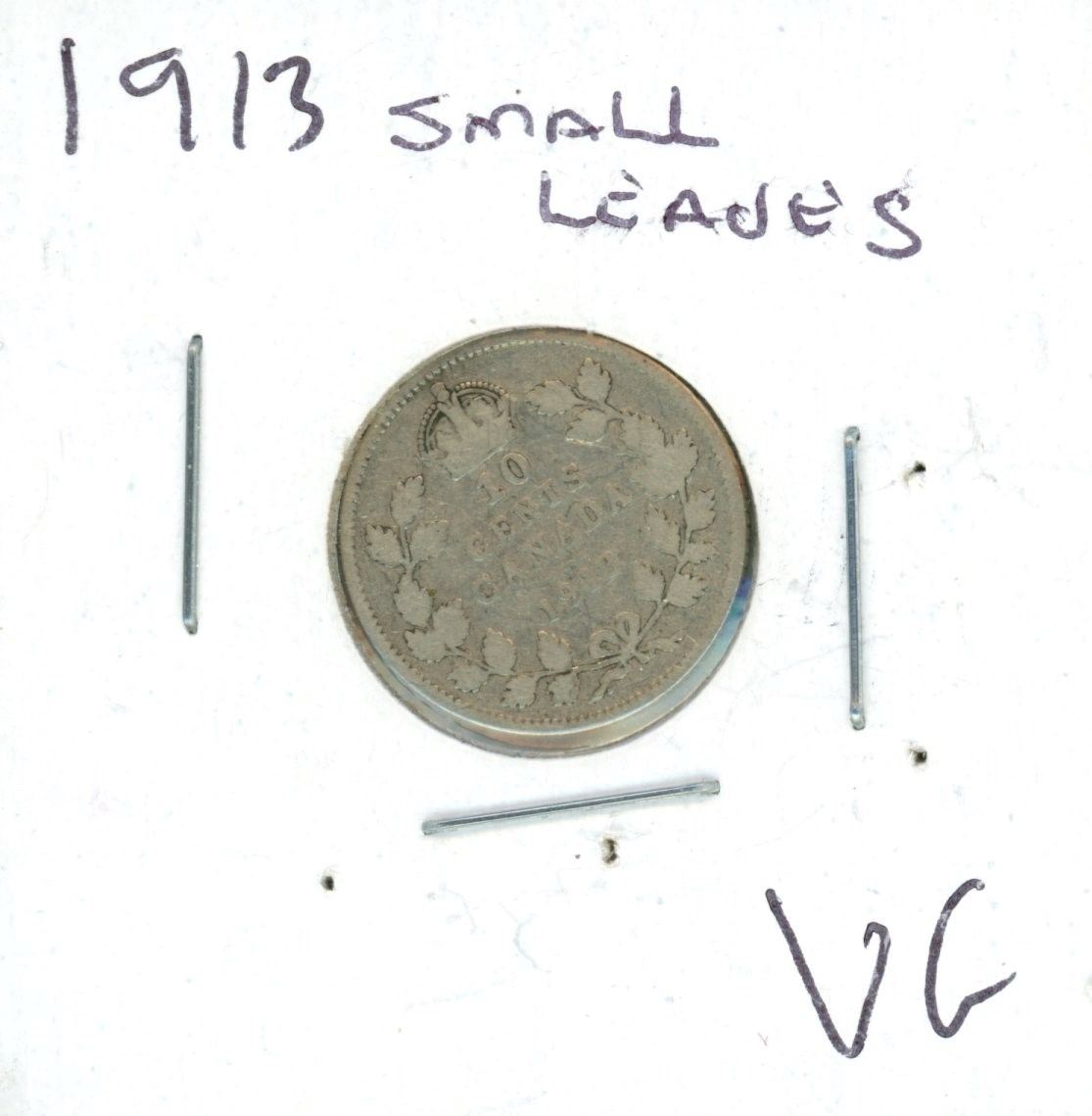 1913 Canadian Silver 10 Cent Coin (VG) (Small Leaves)