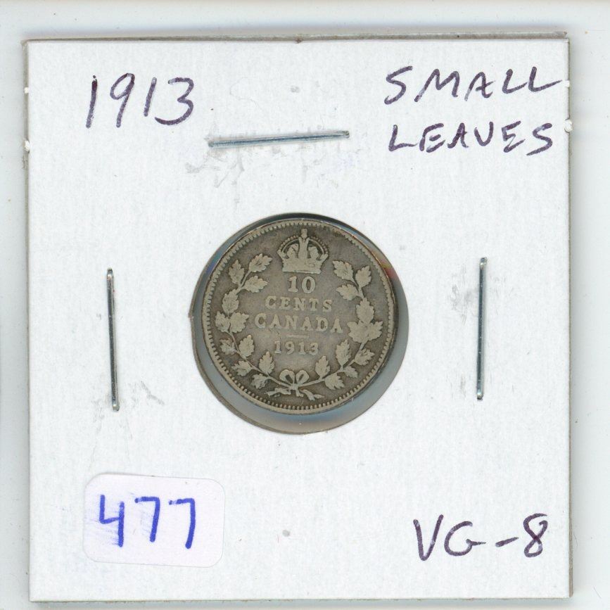 1913 Canadian Silver 10 Cents. Small Leaves variety. VG-8.