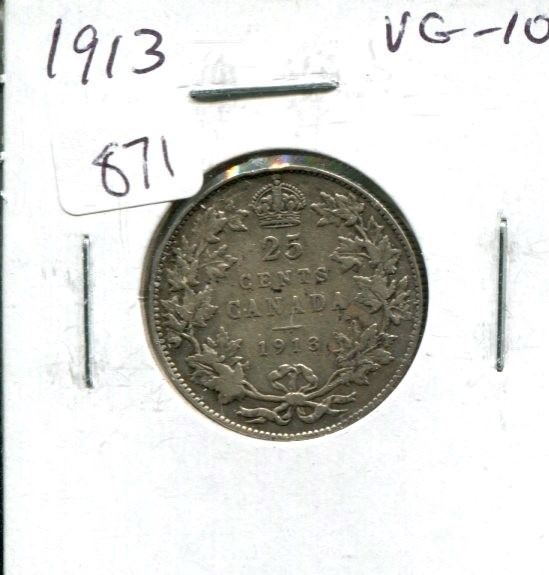 1913 Canadian Silver 25 Cents. George V. VG-10.