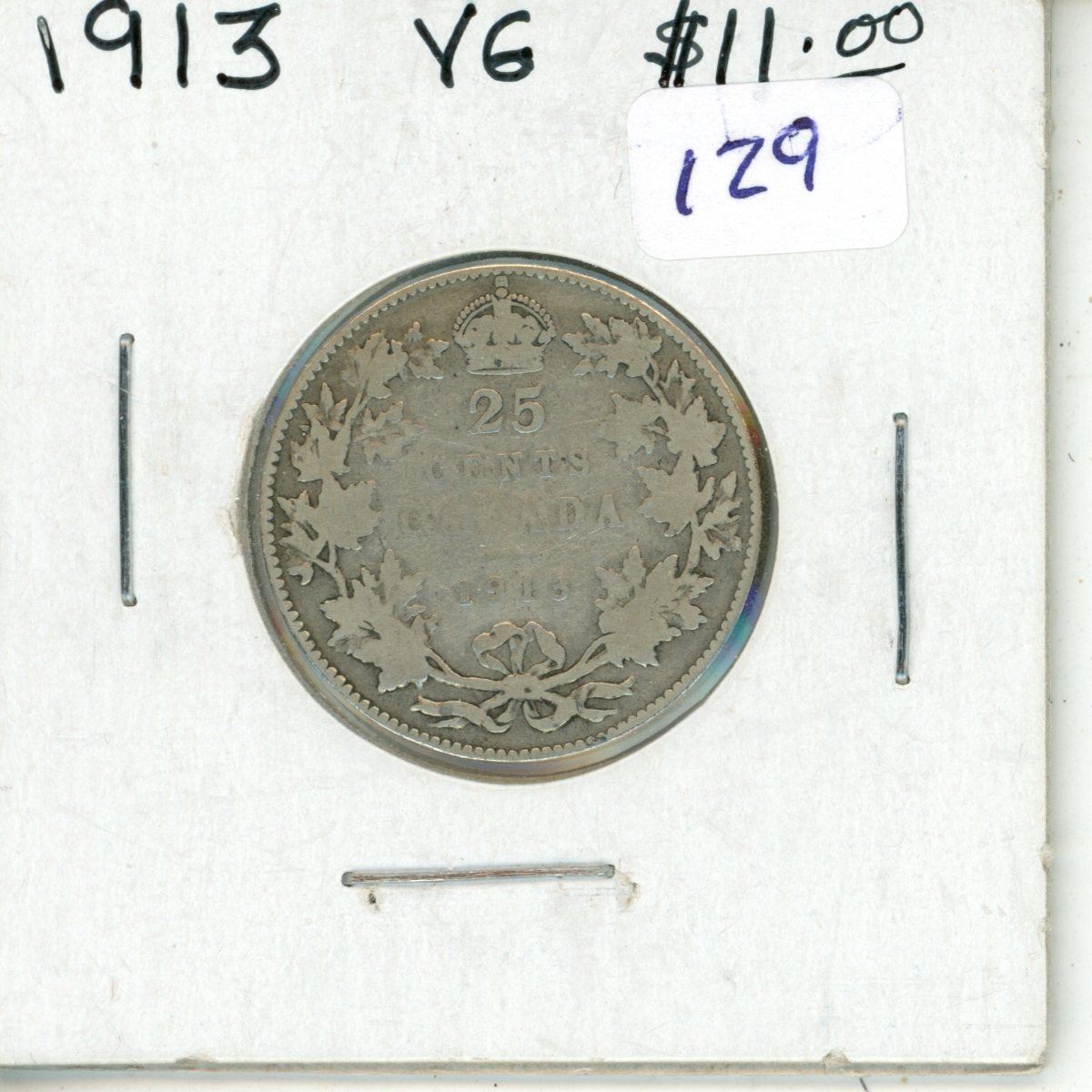 1913 Canadian Silver 25 Cents. King George V. VG-8.