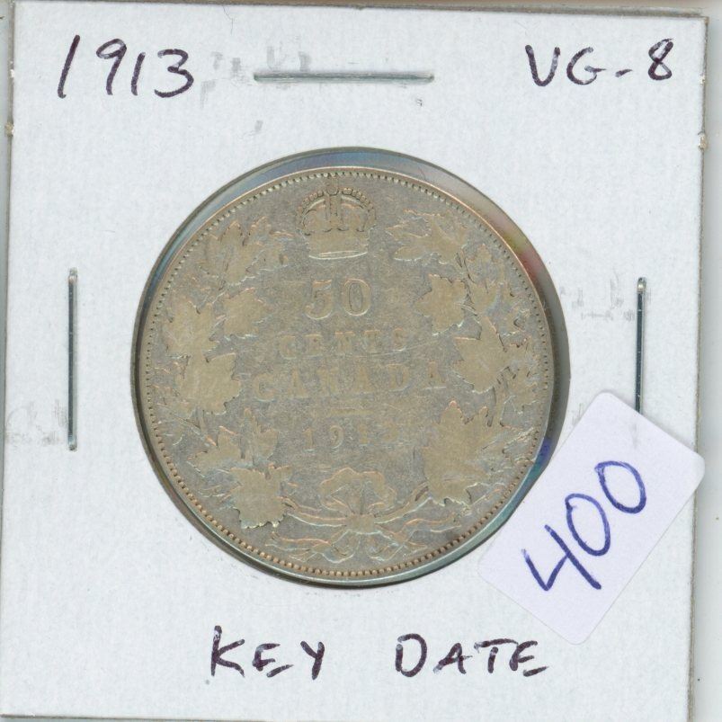 1913 Canadian Silver 50 Cents. Mintage of 265,889. VG-8.