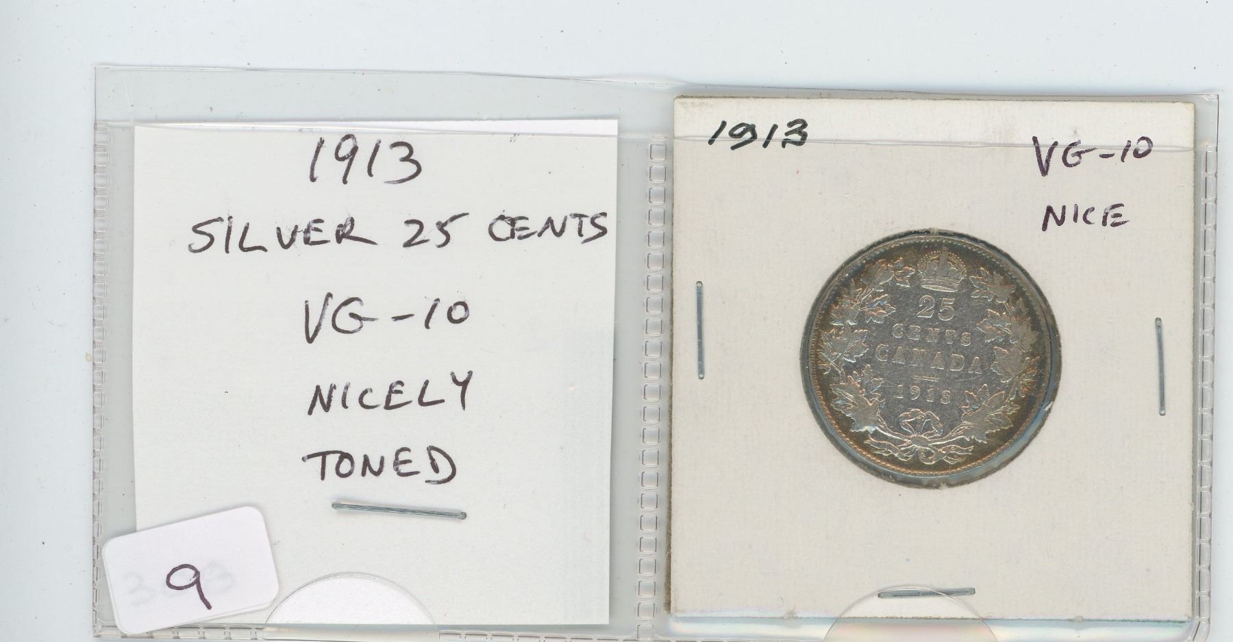 1913 SILVER 25 CENTS. VG-10. NICELY TONED.