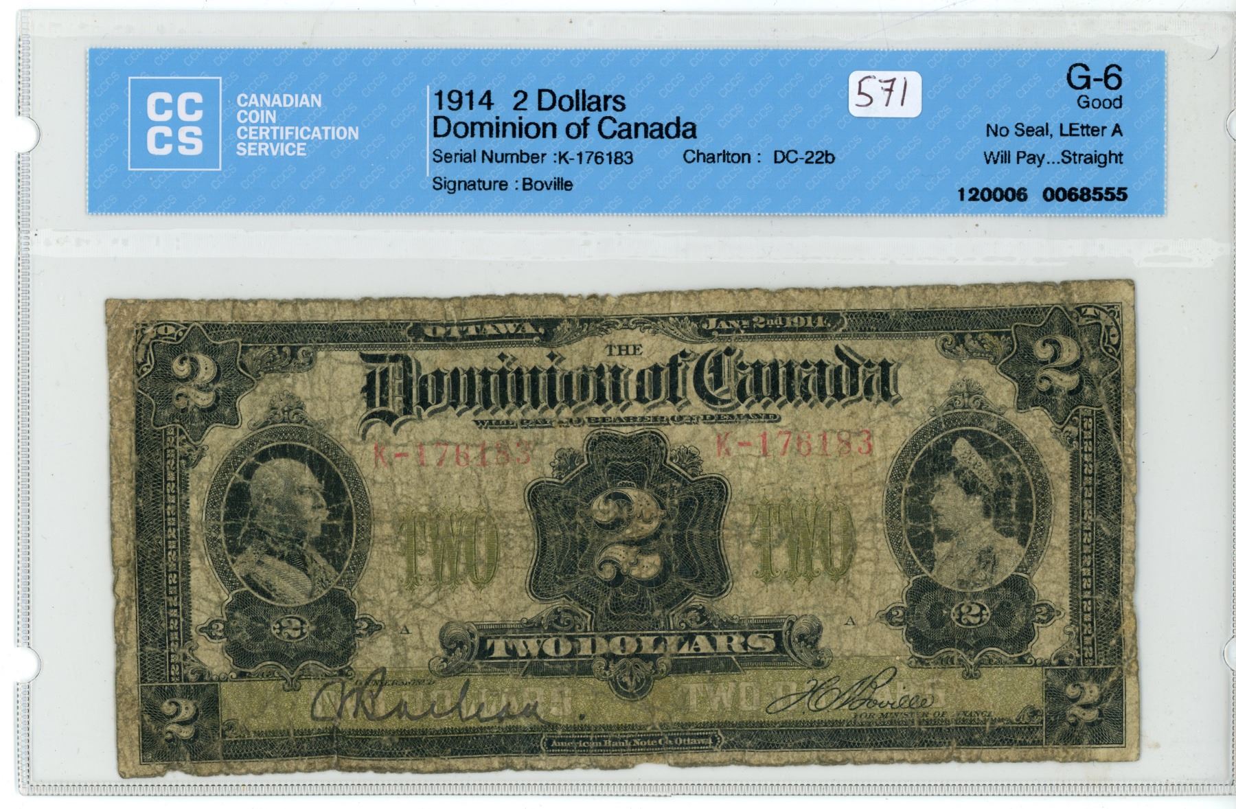 1914 CCCS Graded, "Dominion of Canada" Canadian 2 dollar bill - K-176183 - G6