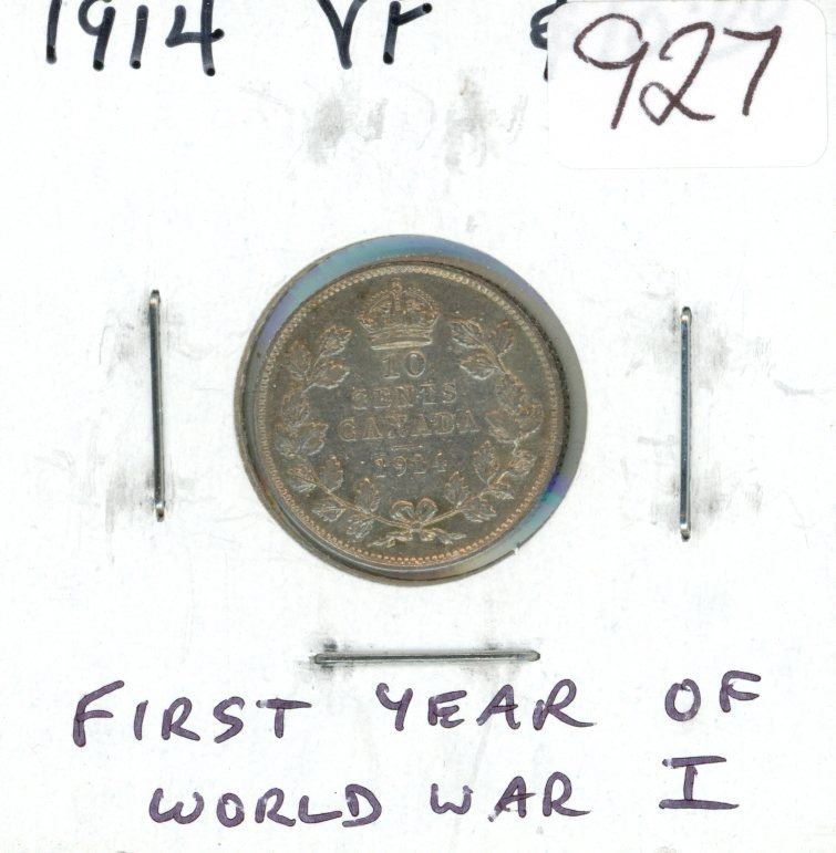 1914 Canadian Silver 10 Cents. First year of World War I. VF-20. Nice.