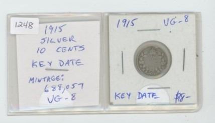 1915 Silver 10 Cents. Issued during World War I. Key Date. Mintage of 688,057. Scarce. VG-8.