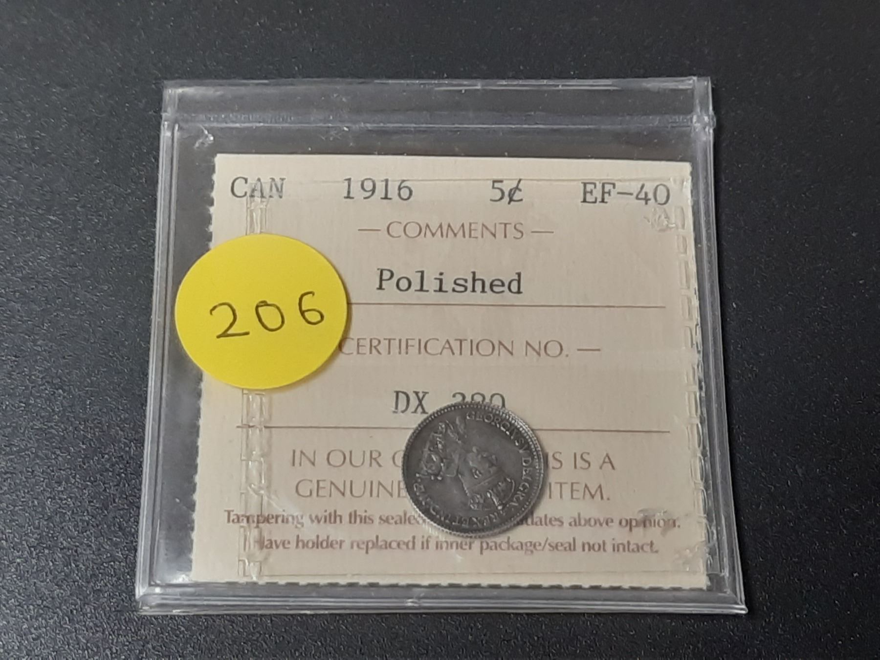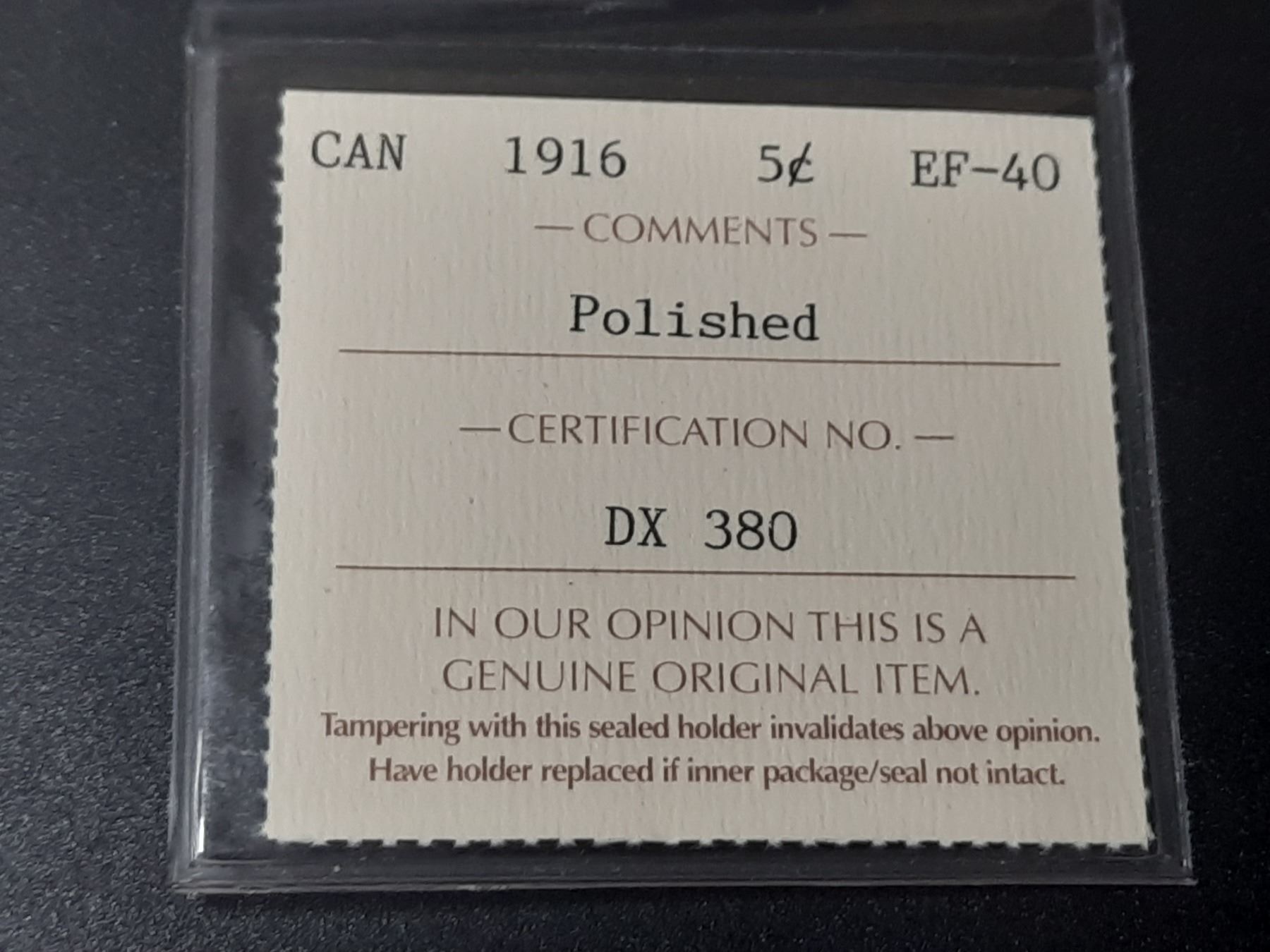 1916 Canadian Silver 5 Cents. ICCS certified and graded EF40 Polished.