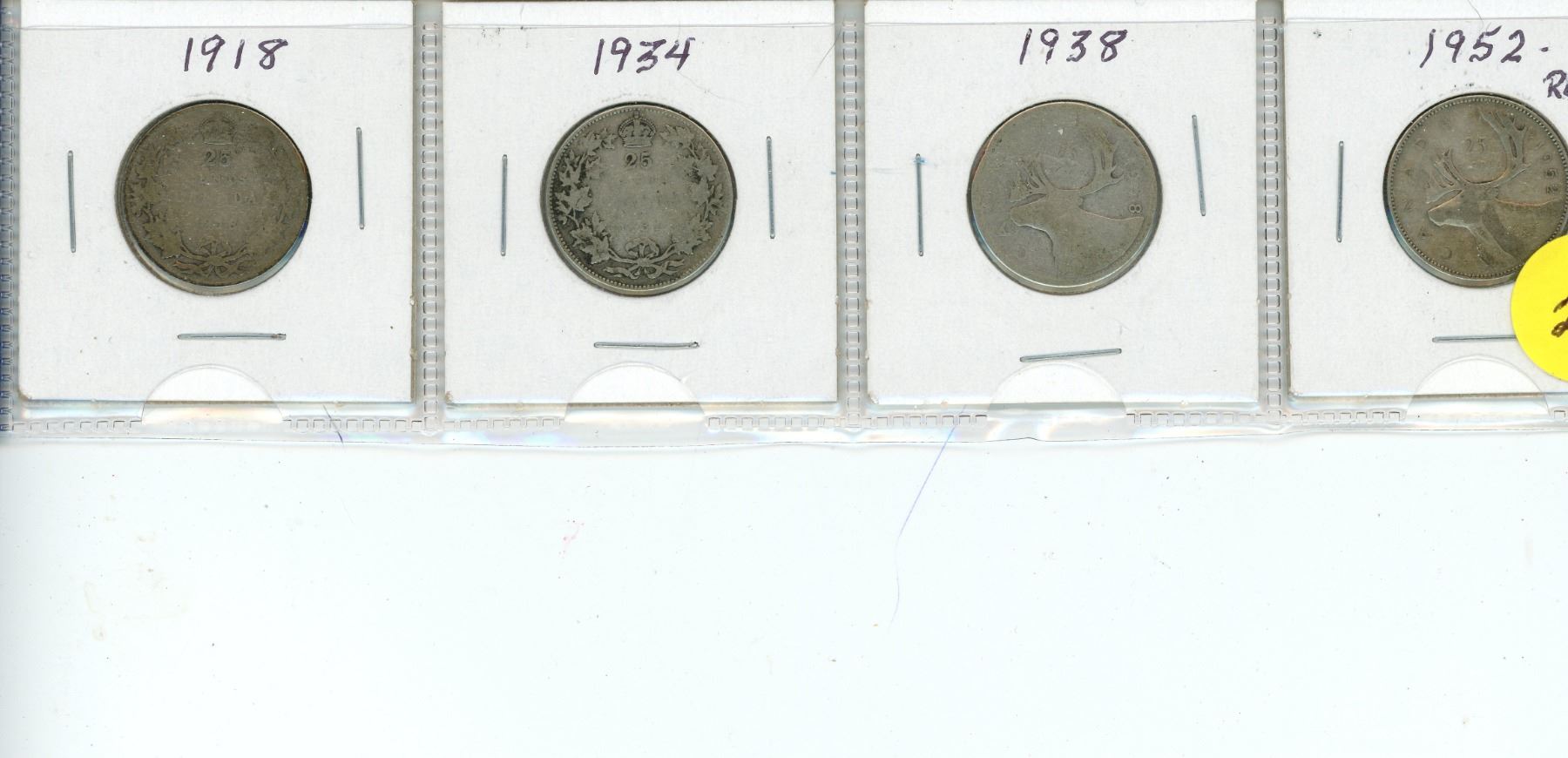 1918, 1934, 1938, 1952 Low Relief Canadian Silver Quarters