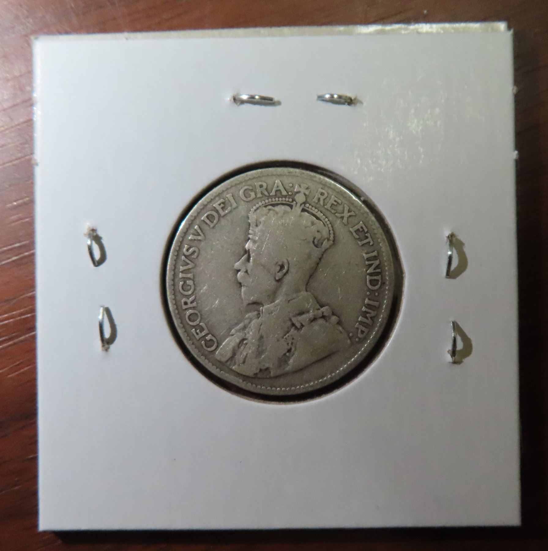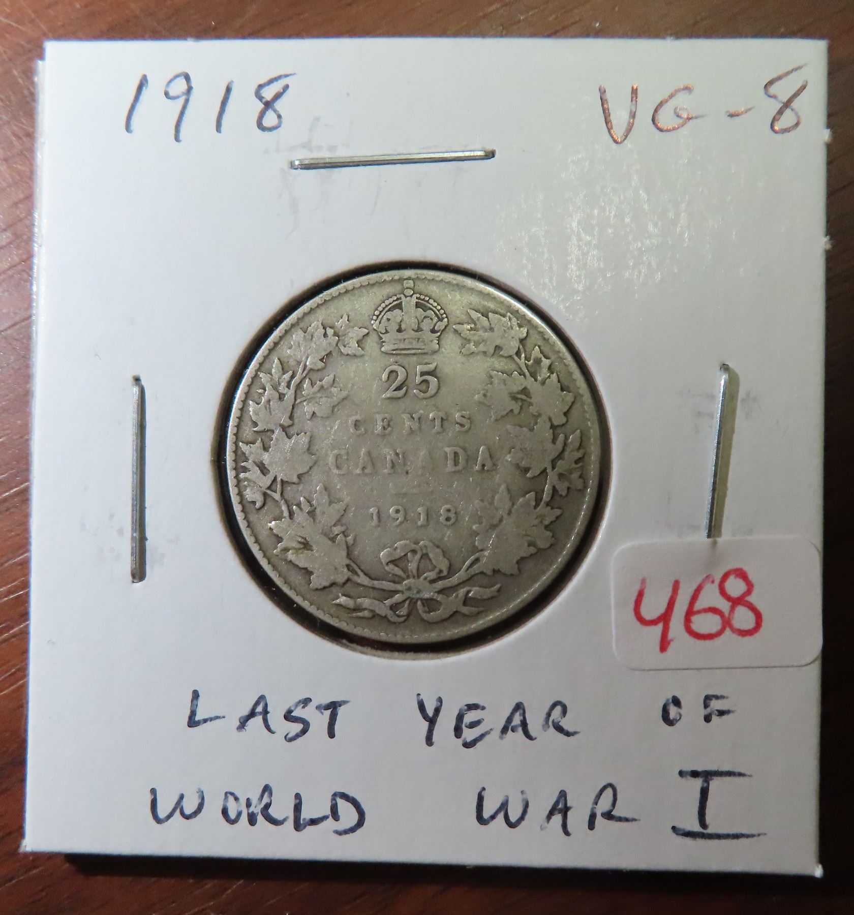 1918 Canadian Silver 25 Cents. The last year of World War I. VG-8.