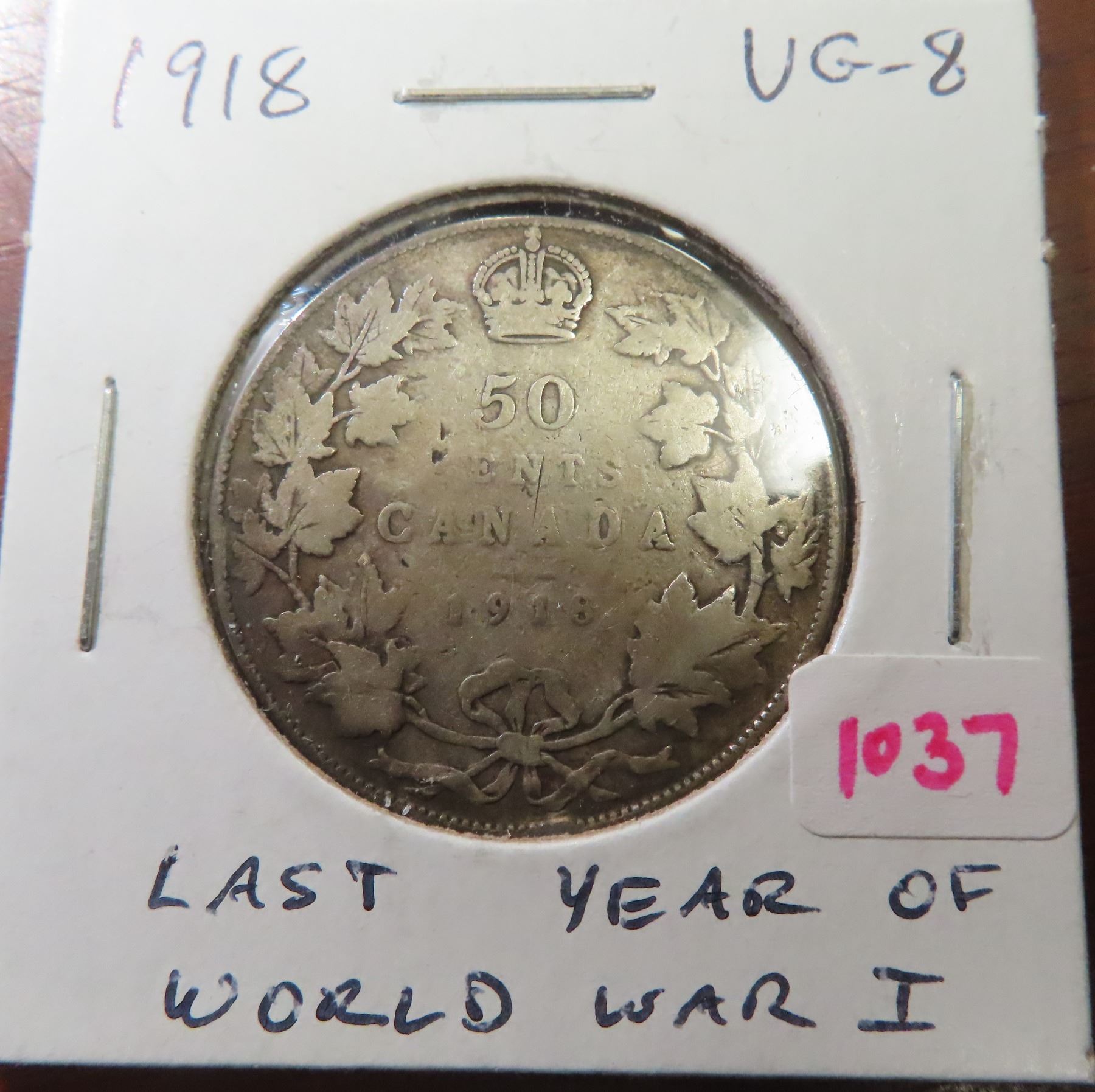 1918 Canadian Silver 50 Cents. The last year of World War I. VG-8.