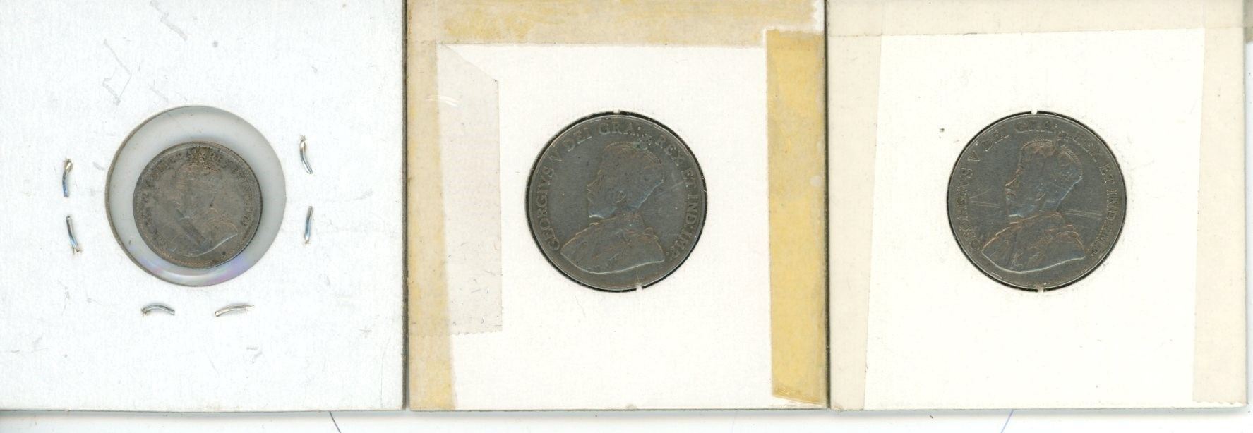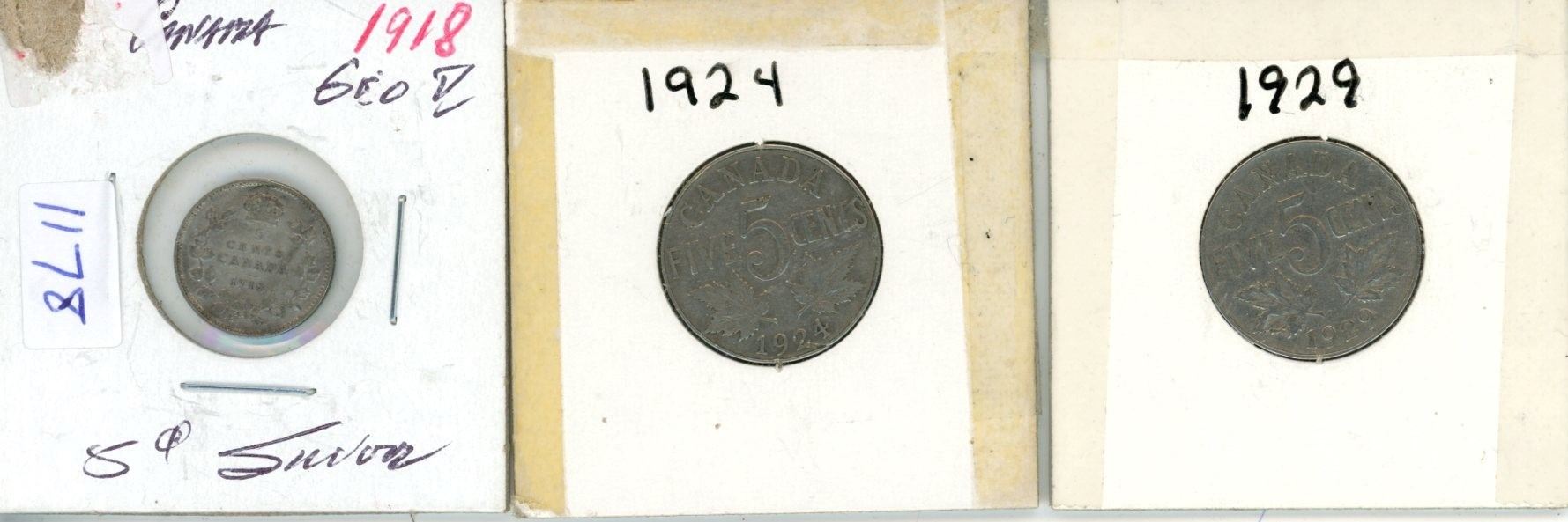 1918(Silver), 1924, 1929 Canadian 5 Cent Coins - 3 Piece