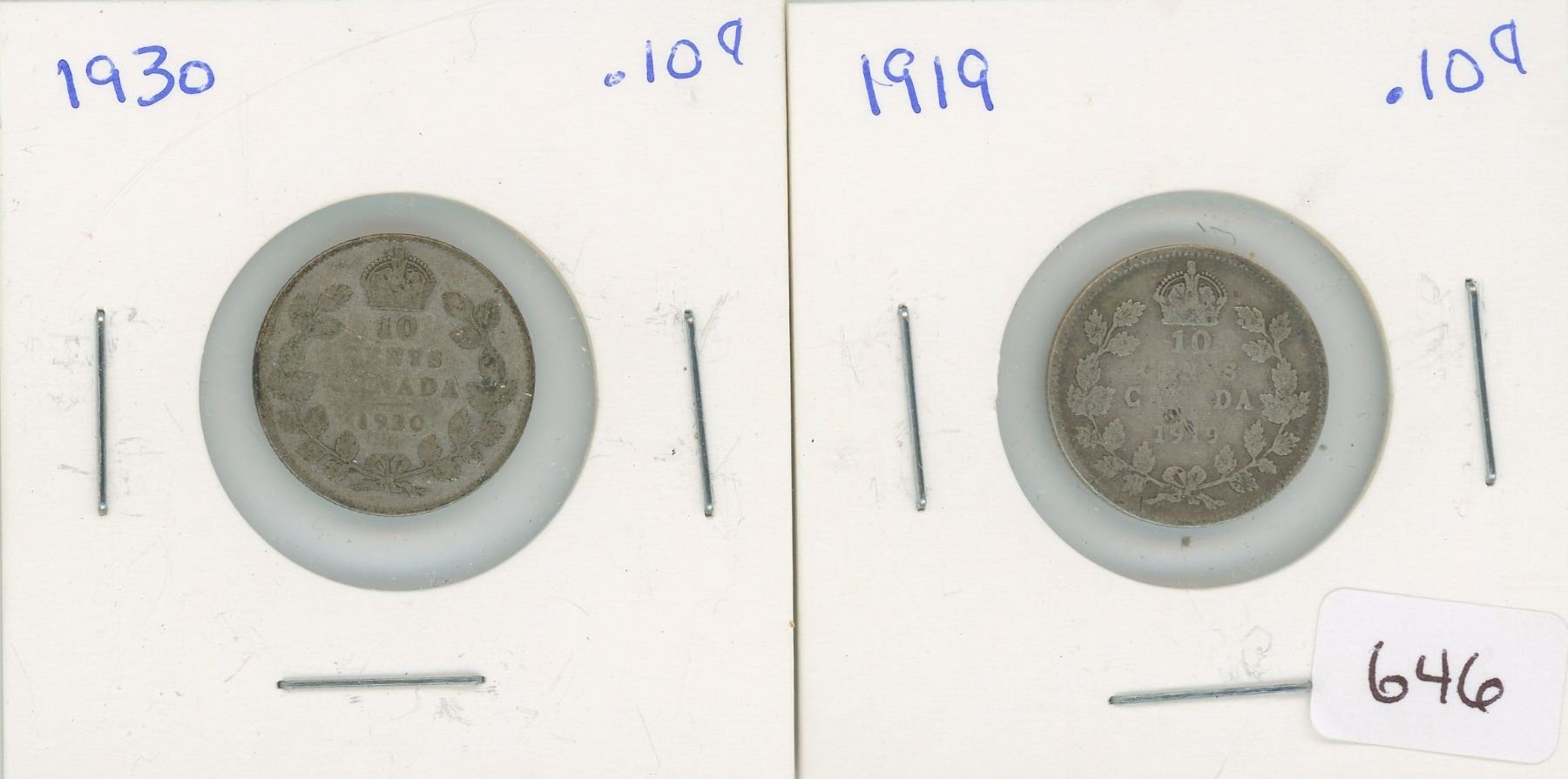 1919 10 Cents Canadian Silver, 1930 10 Cents Canadian Silver