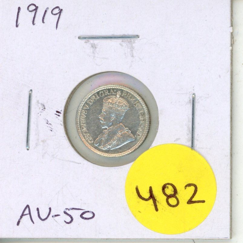 1919 Canadian Silver 5 Cents. AU-50. Bright White. Nice.