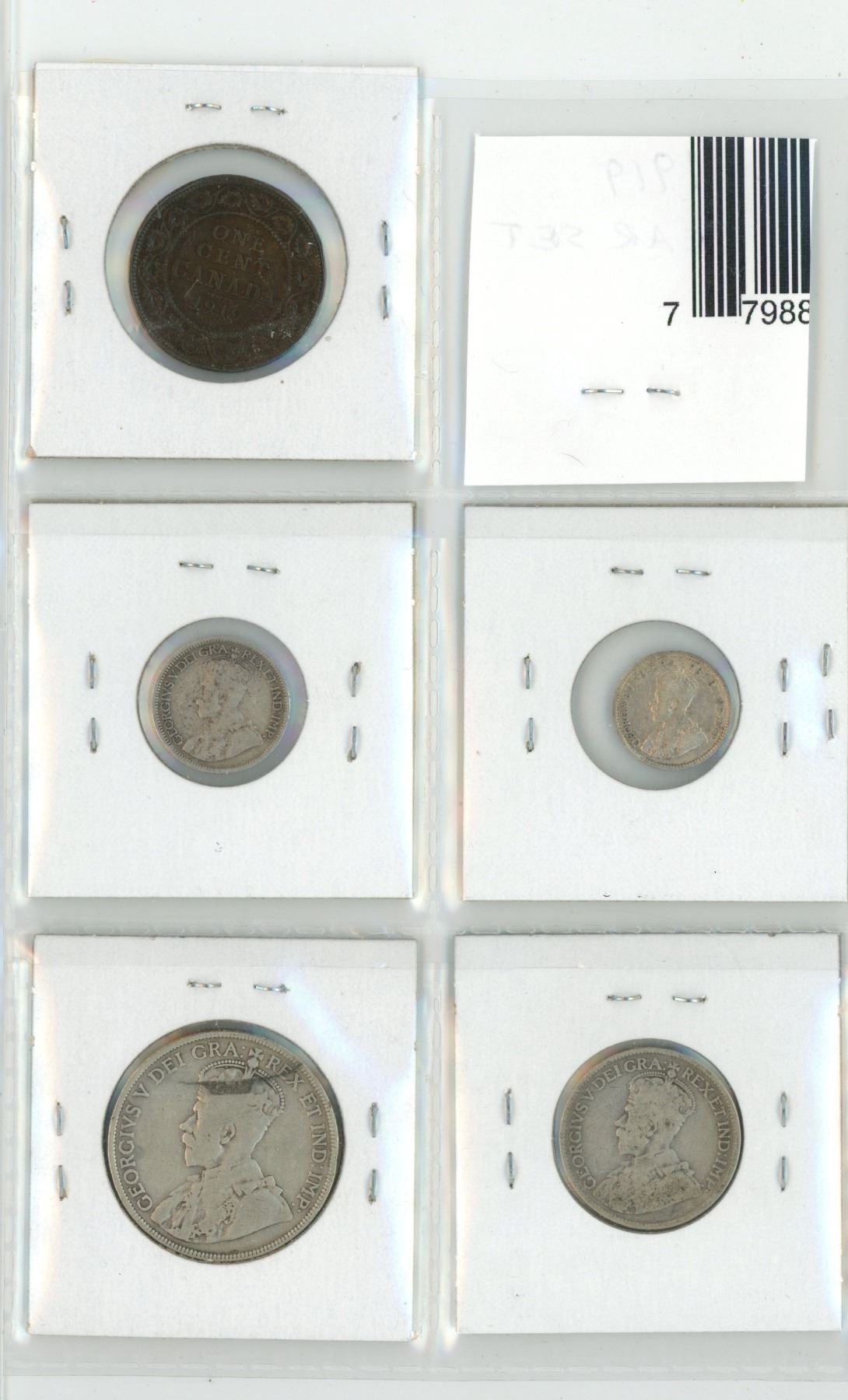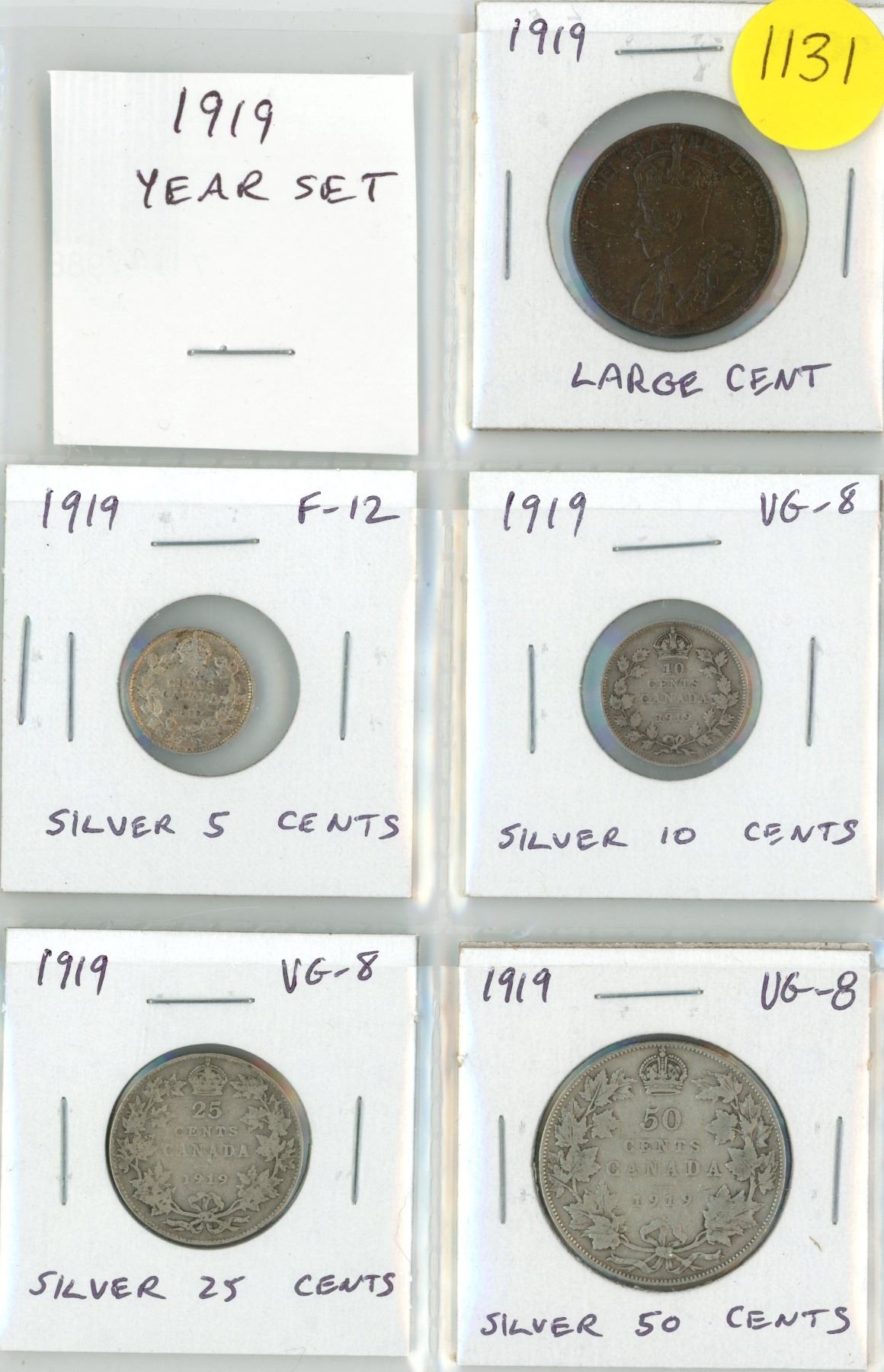 1919 Year Set. Complete set includes large cent, silver 5 cents, silver 10 cents, silver 25 cents & silver 50 cents. Coins grade VG-8 to VF-30.