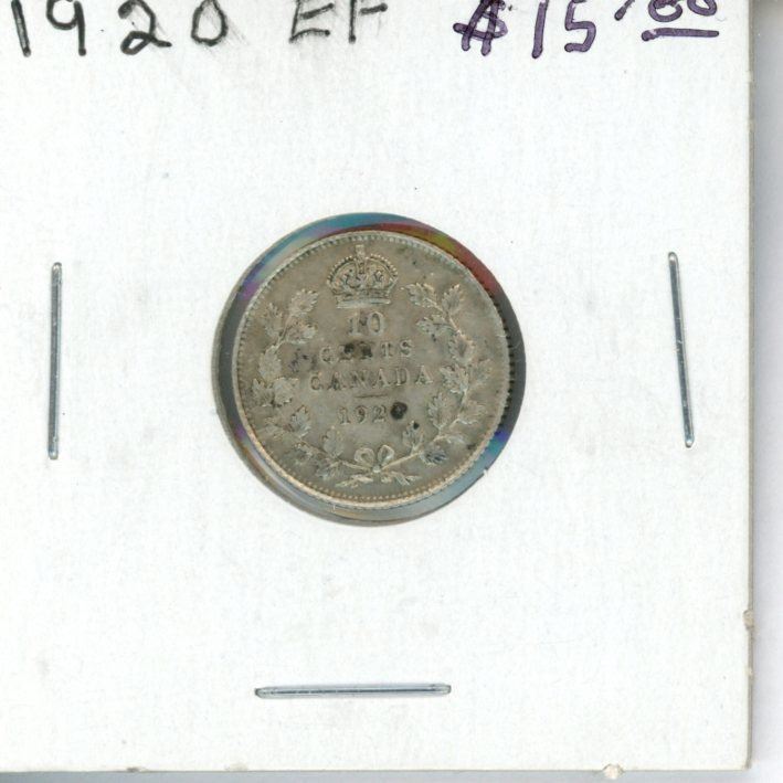 1920 Canadian Silver 10 Cents. EF-40. Nice.