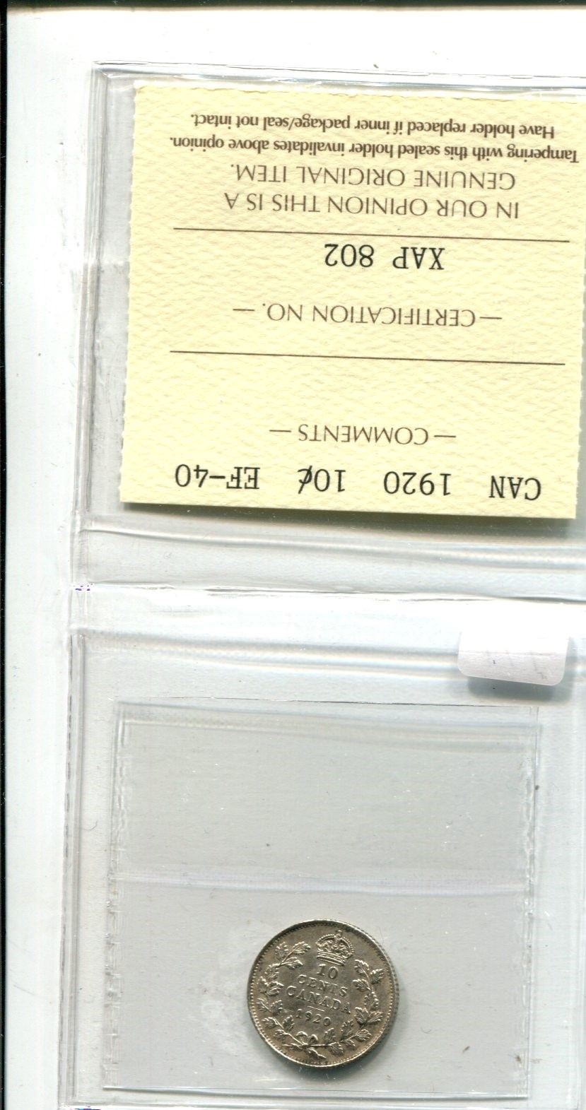 1920 Canadian Silver 10 Cents. ICCS certified and graded EF-40.