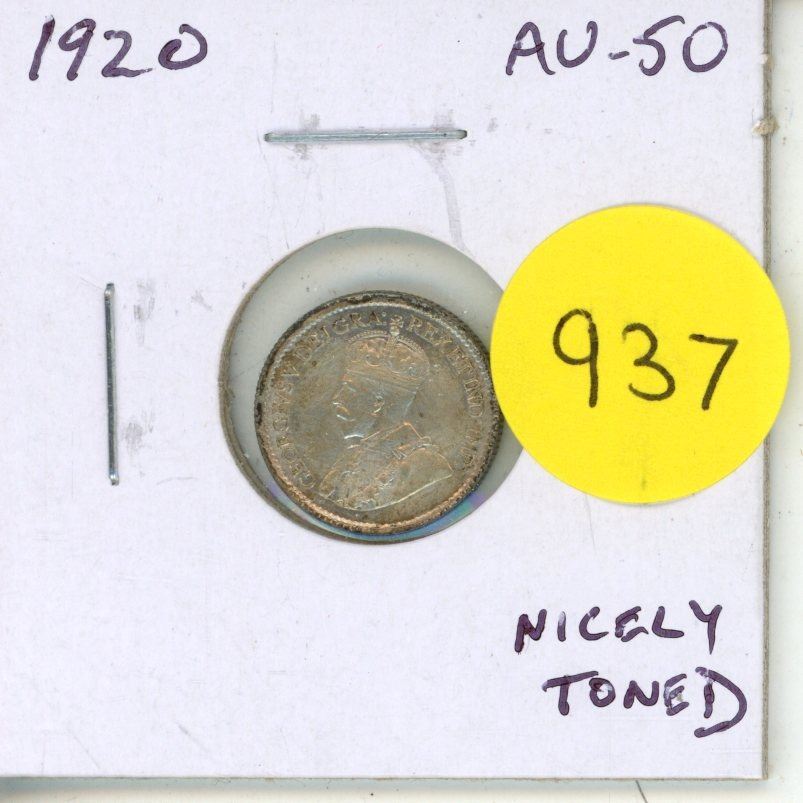 1920 Canadian Silver 5 Cents. AU-50. Nicely Toned.