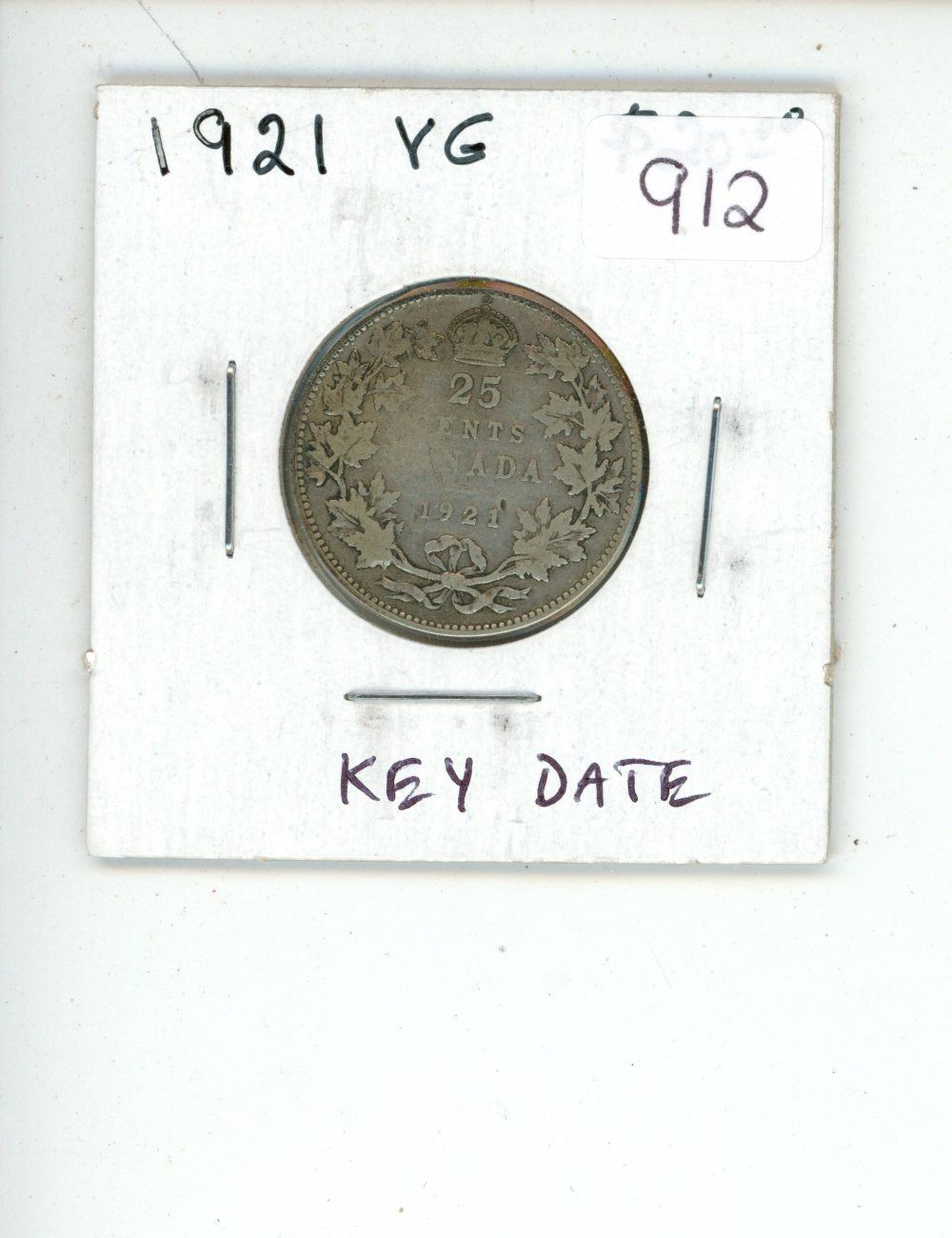 1921 Canadian George V Silver 25 Cents. Key Date. Mintage of 597,337. VG-8.