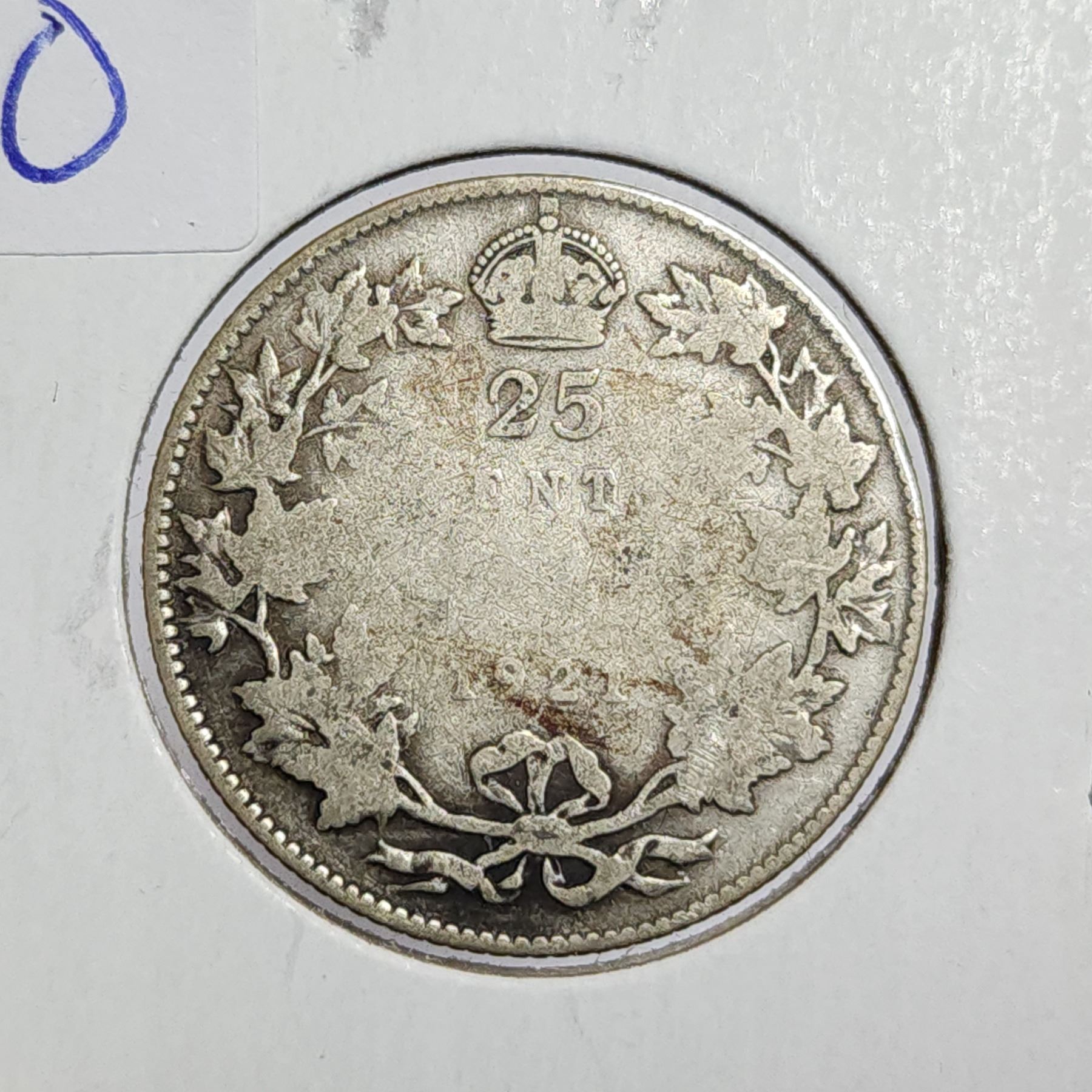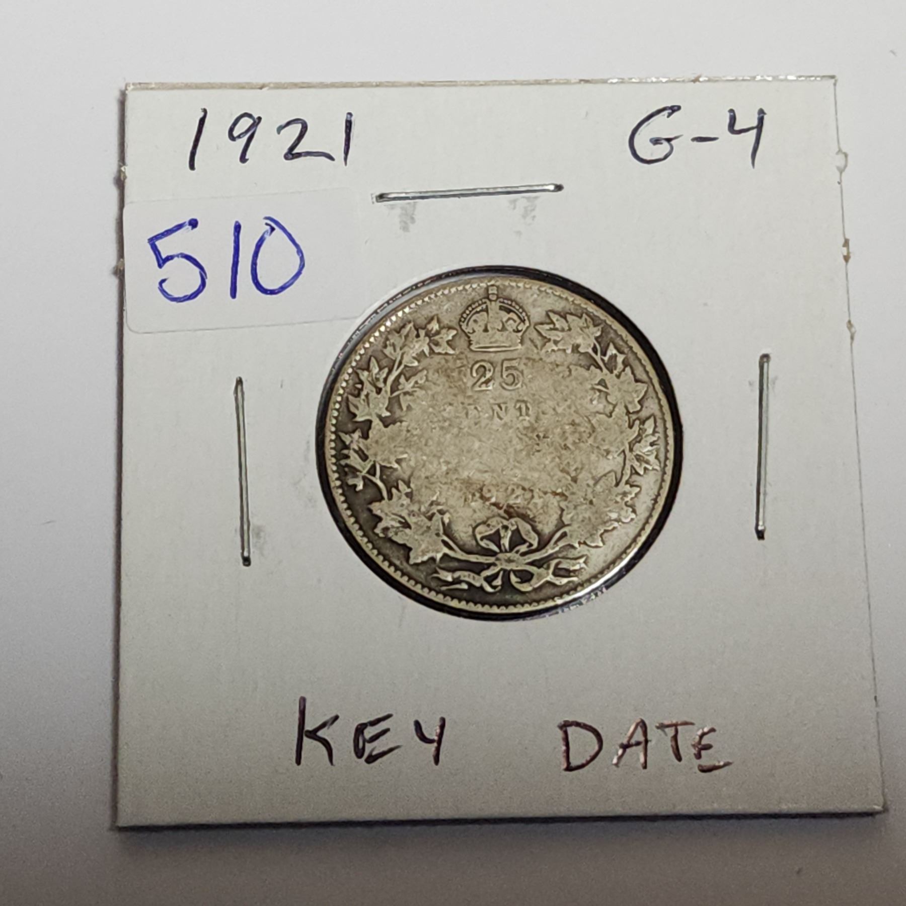 1921 Silver 25 Cents. Key Date. Mintage of 597,337. G-4.