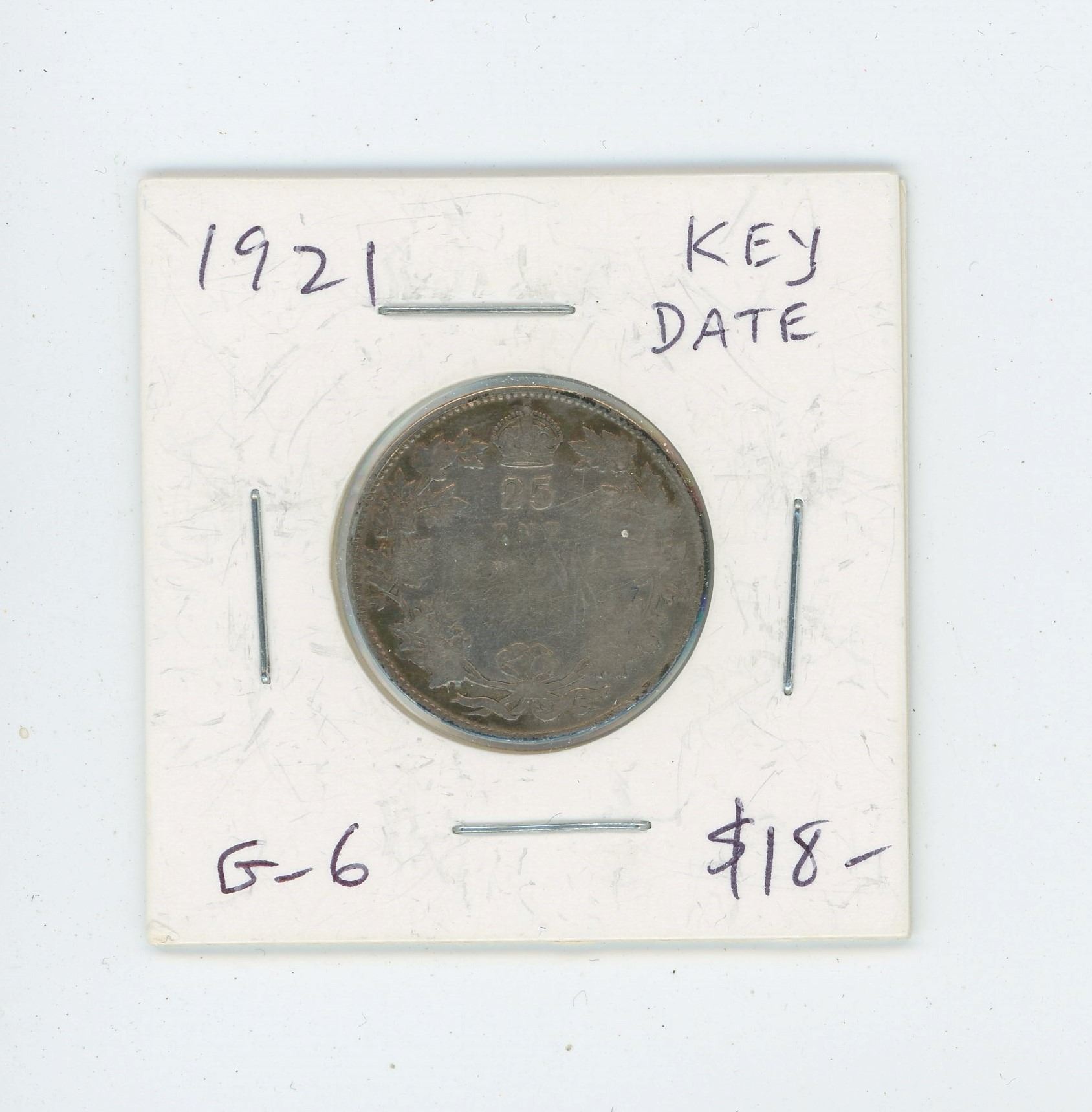 1921 Silver 25 Cents. Key Date. Mintage of 597,337. G-6.