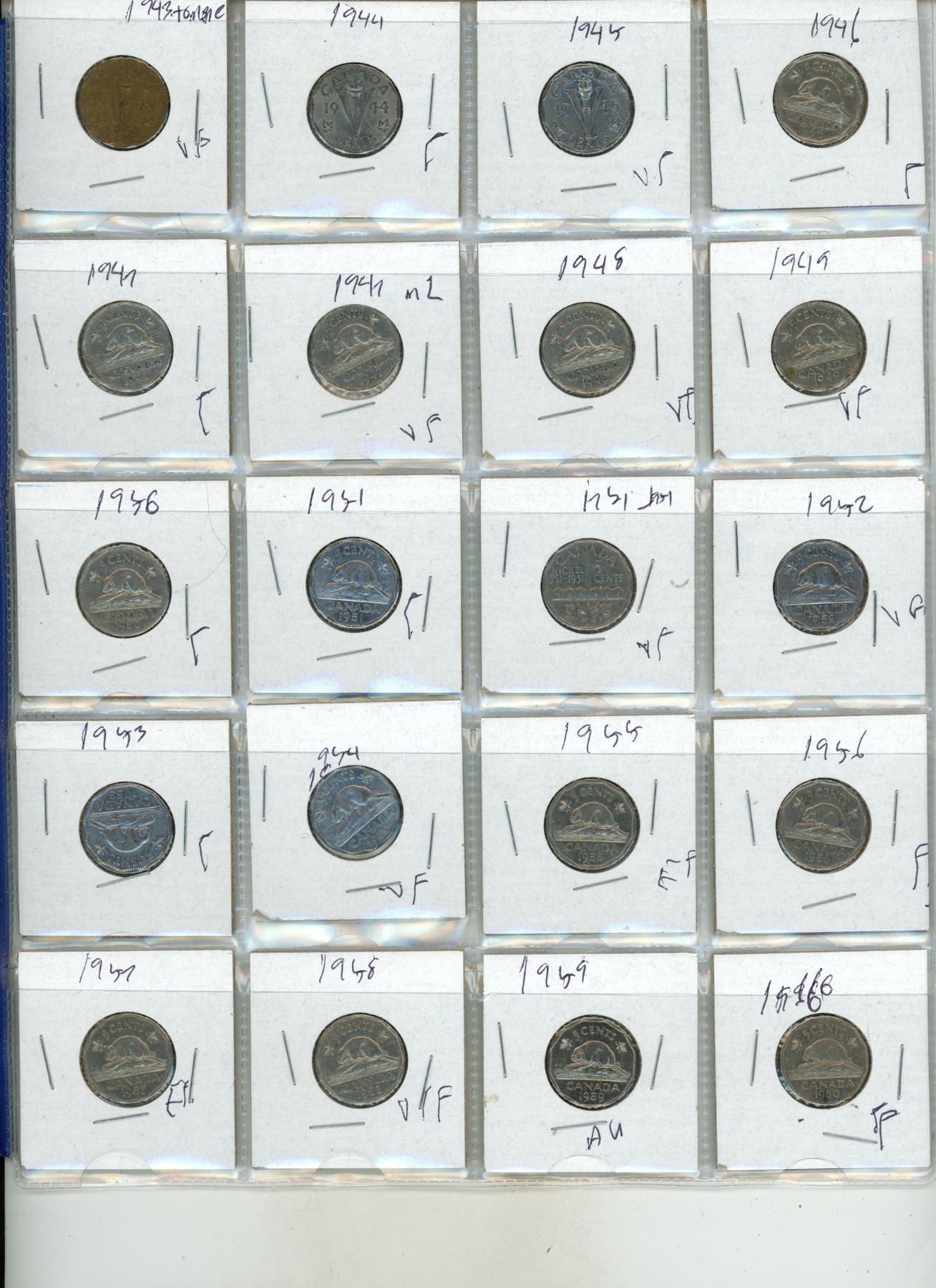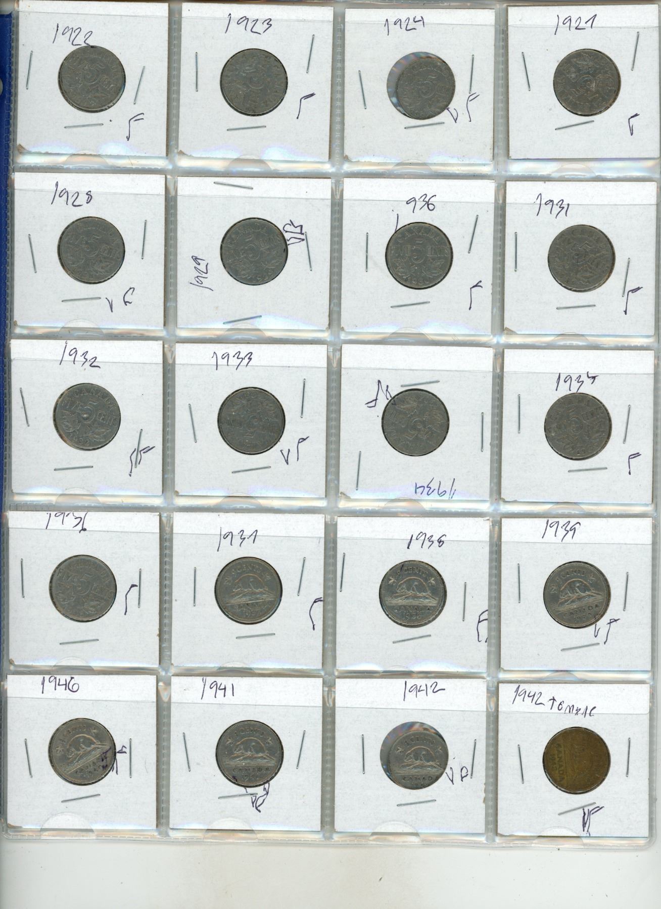 1922-1960 Canadian 5 Cents Coins. (1925 and 1926 Missing) (Total 40 Coins)