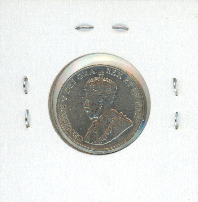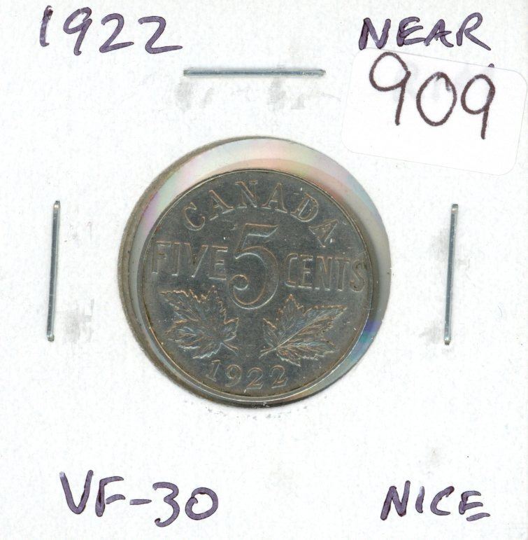 1922 Canadian George V Nickel 5 Cents. First year of the Nickel. Near Rim variety (S is Near the Rim). VF-30. Nice.