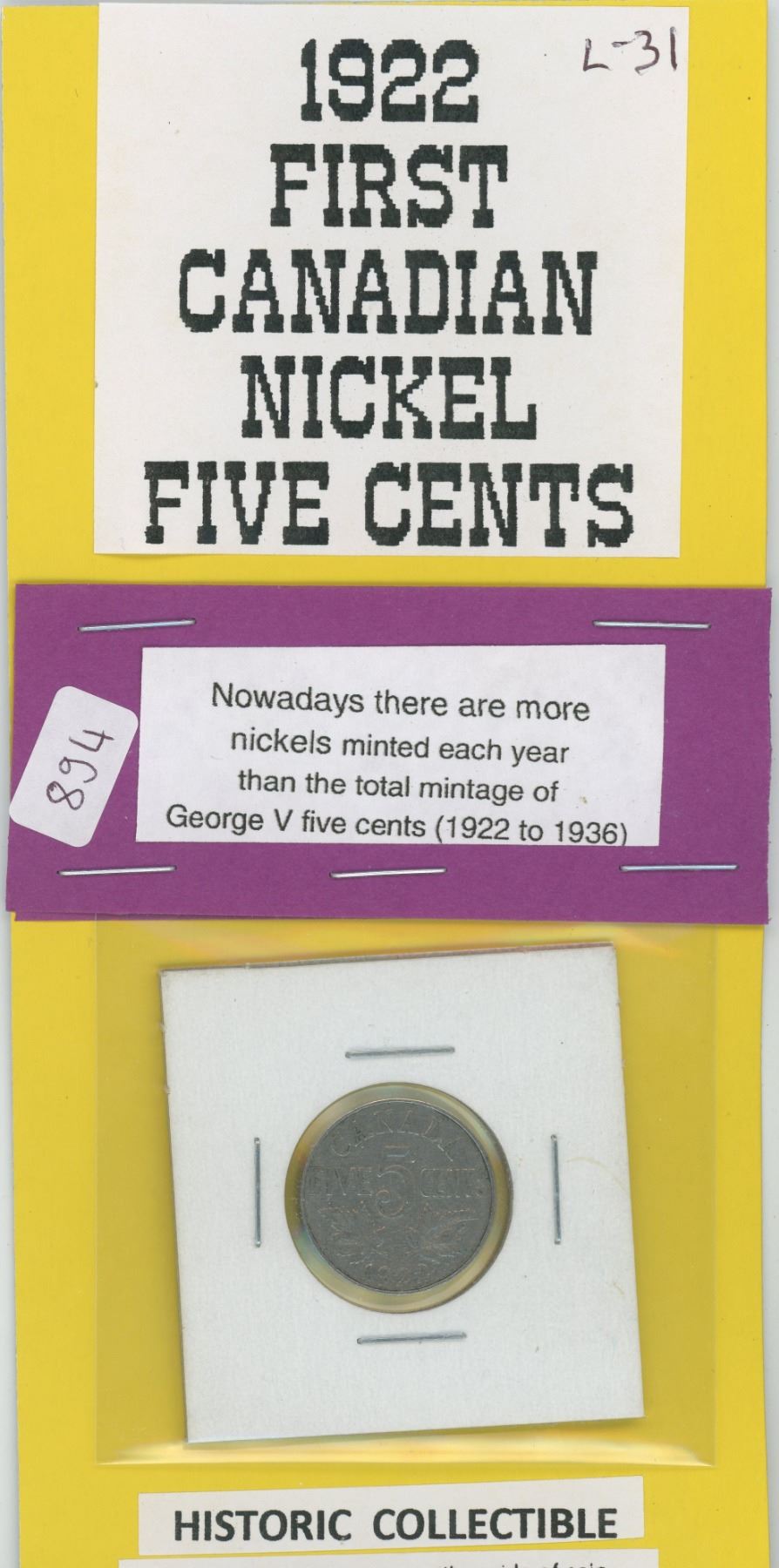 1922 First Year of Issue for the Canadian Nickel 5 cent