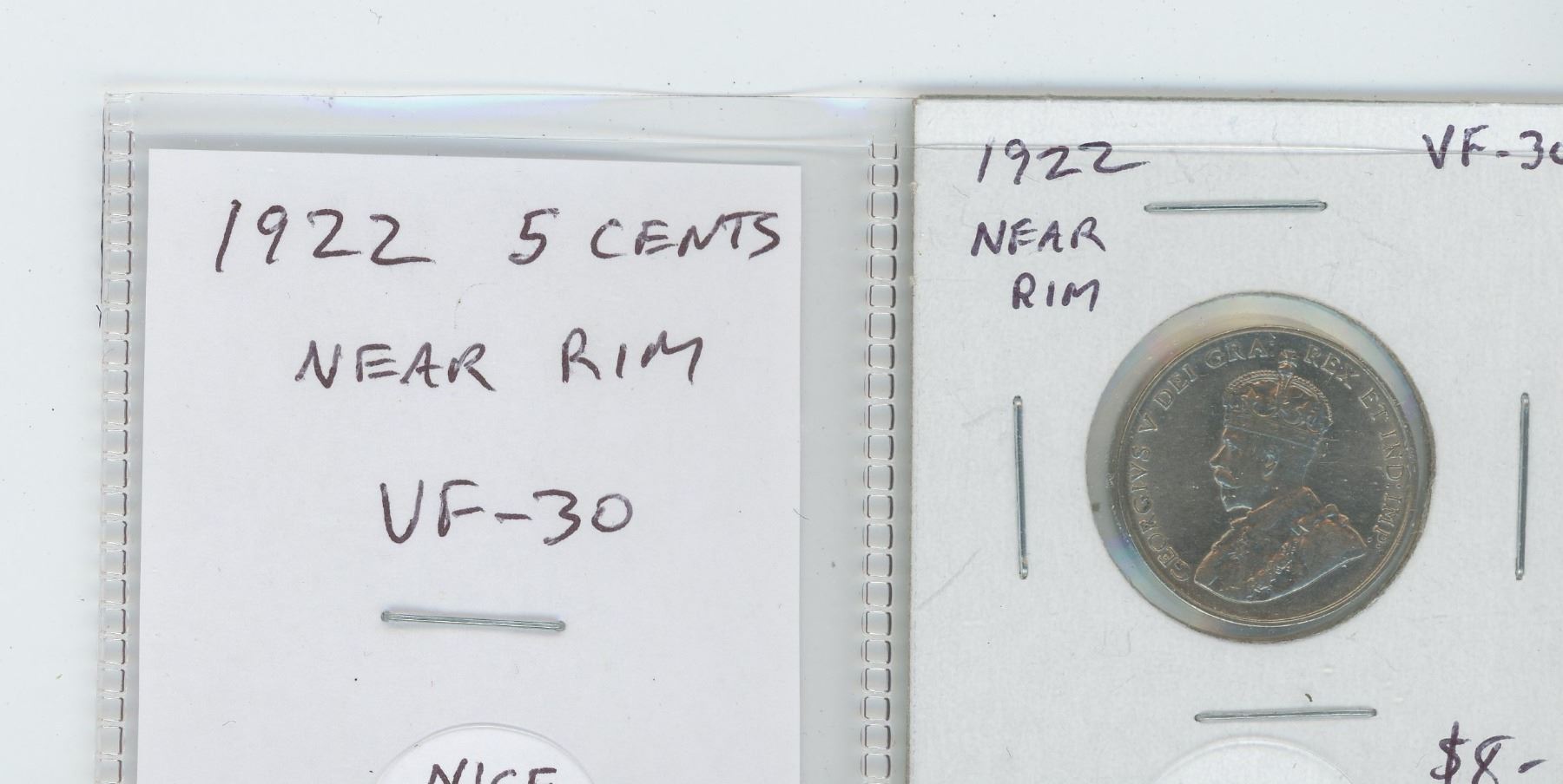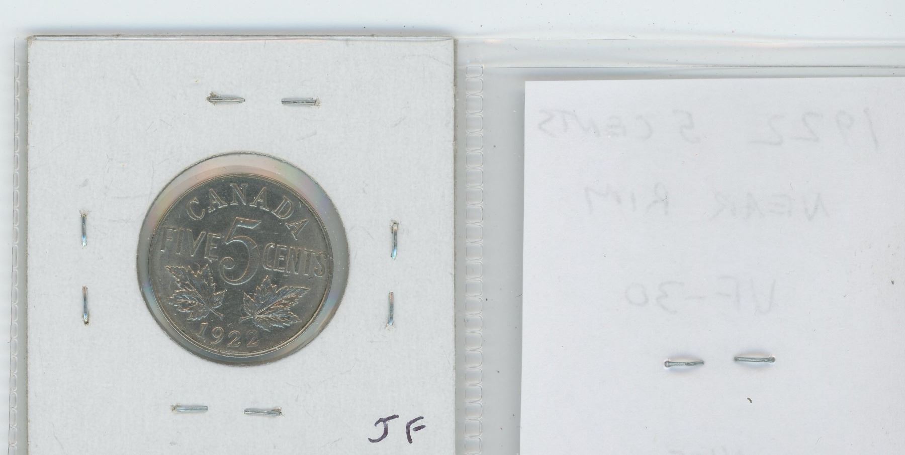 1922 NICKEL 5 CENTS. NEAR RIM VARIETY. VF-30. NICE. THE FIRST YEAR OF THE NICKEL 5 CENTS.