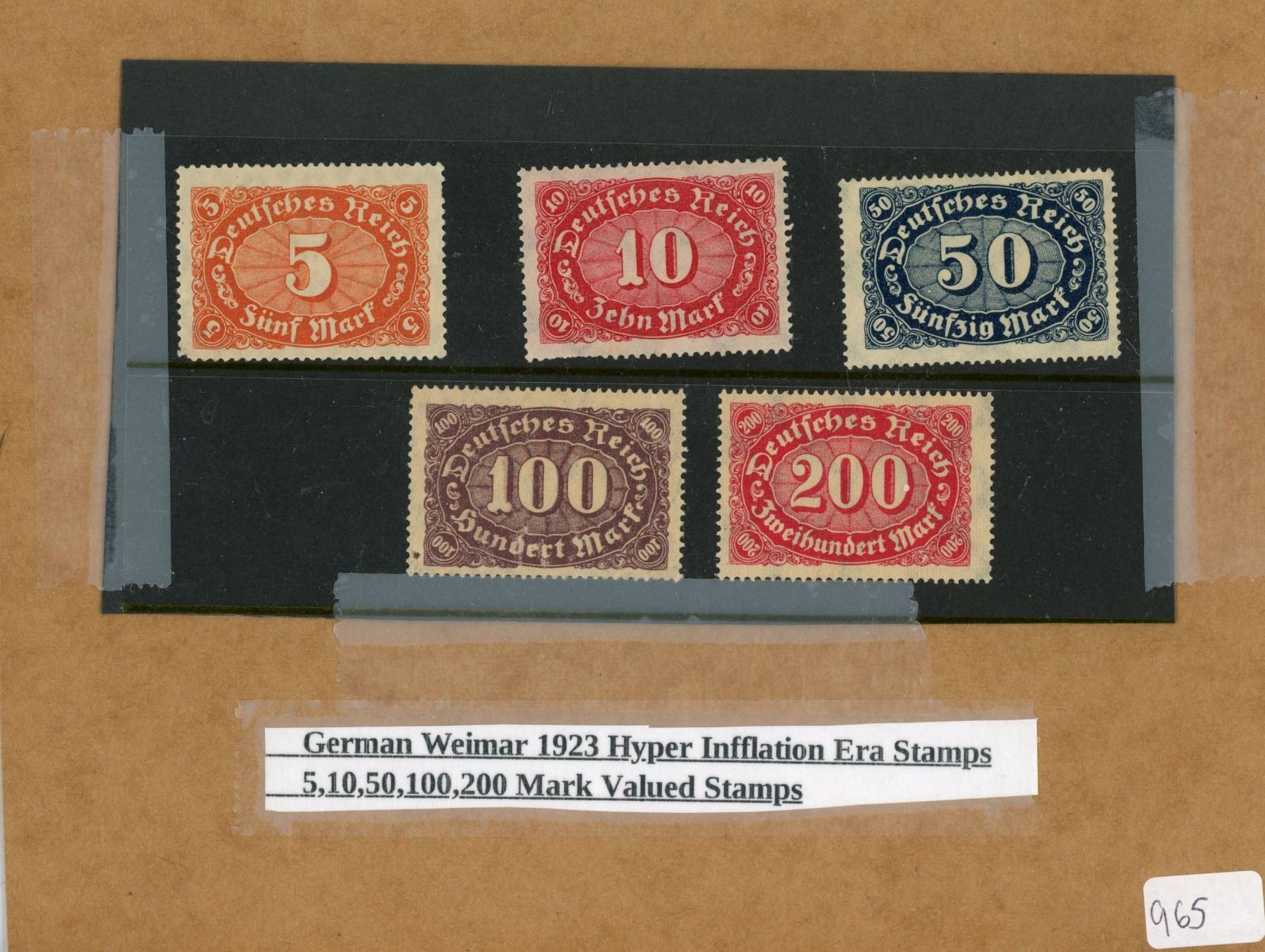 1923 5X German Weimar Hyper Inflation Era Stamps - 5, 10, 50, 100, 200 Mark Valued Stamps